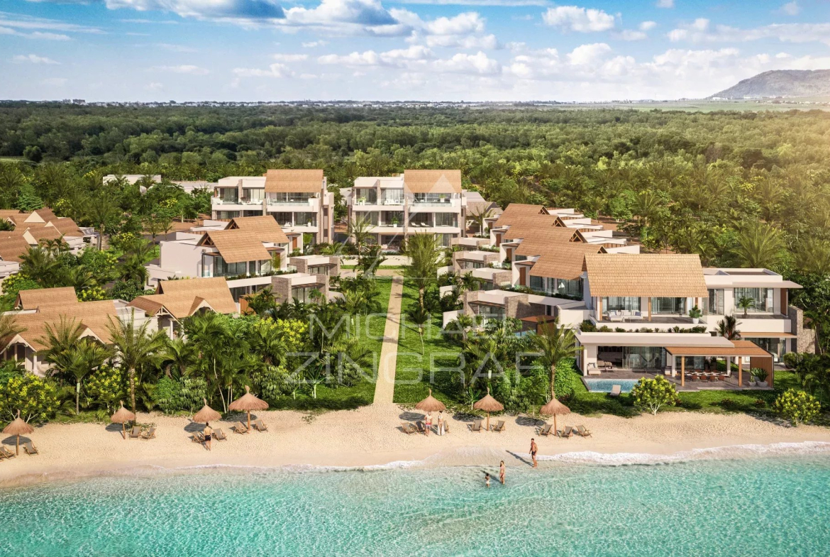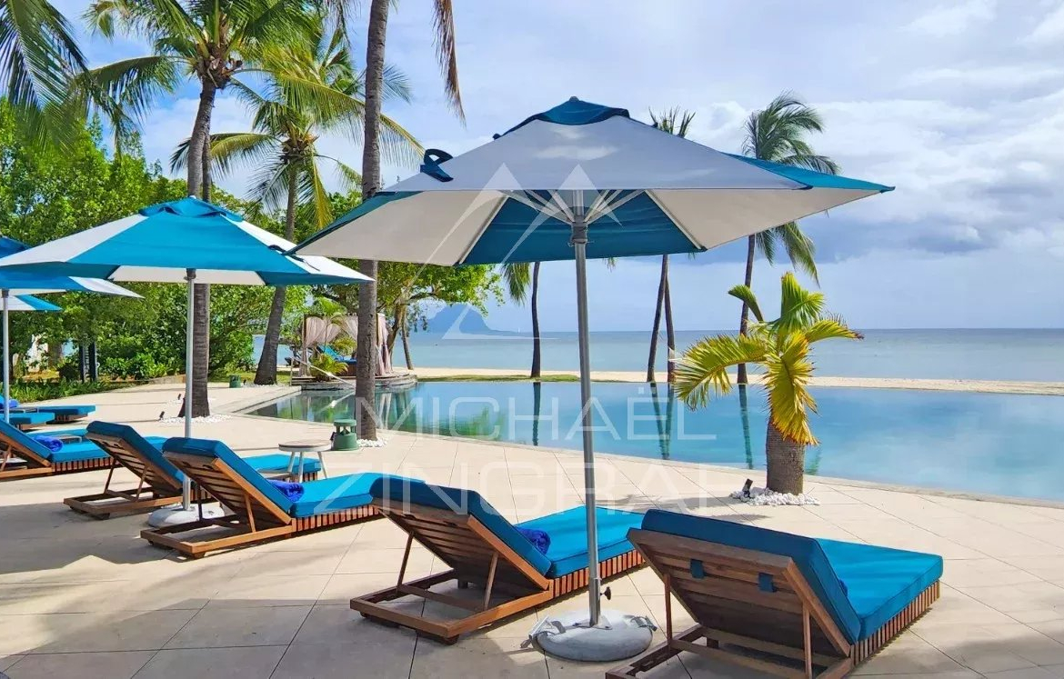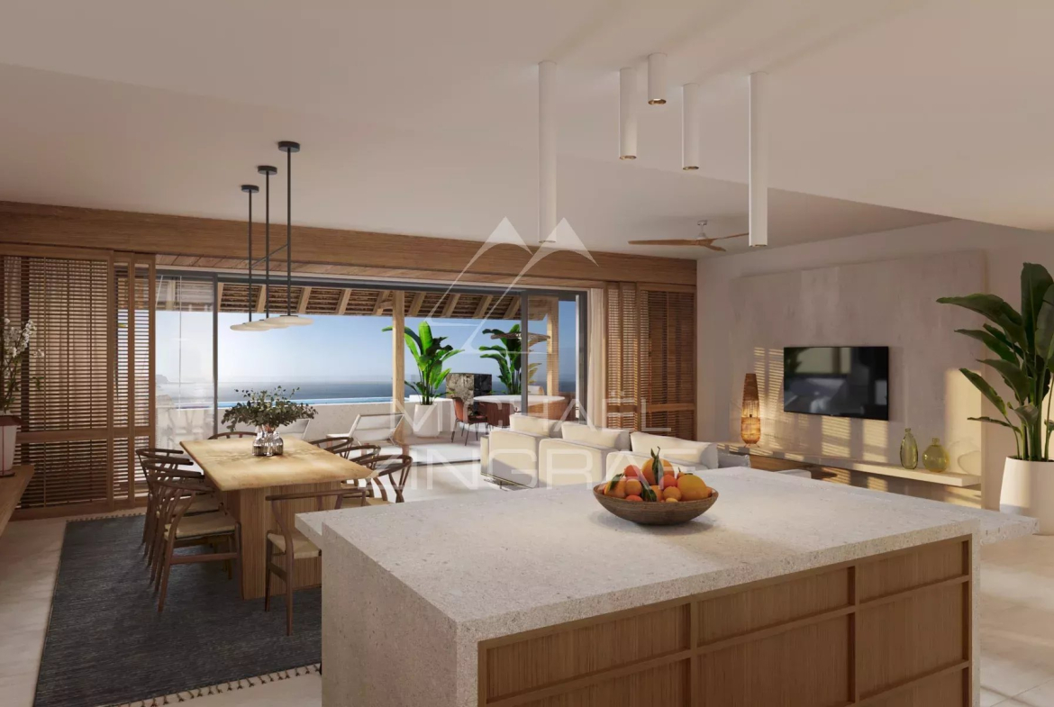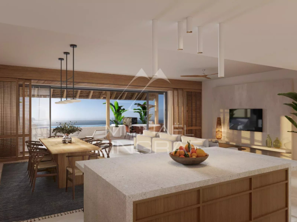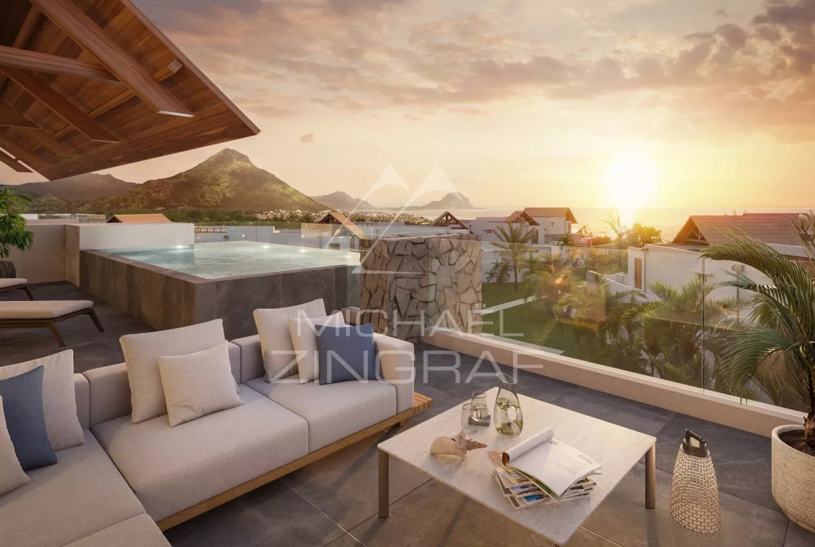 Seulement 2 penthouses avec piscine, de 3 chambres en-suite, offrant une vue panoramique spectaculaire sur le Morne. La terrasse suspendue entre azur et eaux turquoises prolonge naturellement un intérieur luxueux.