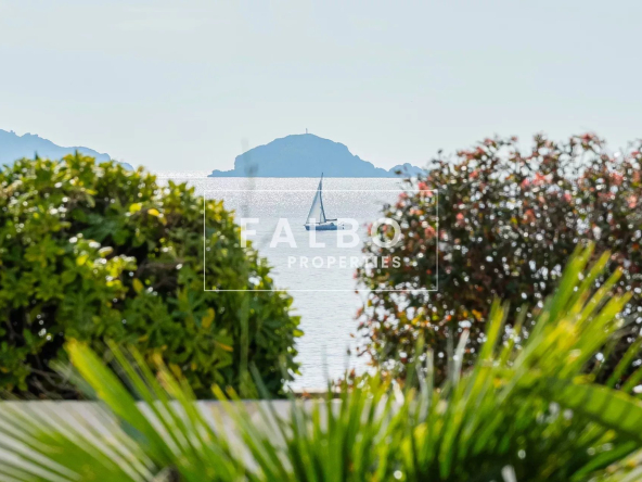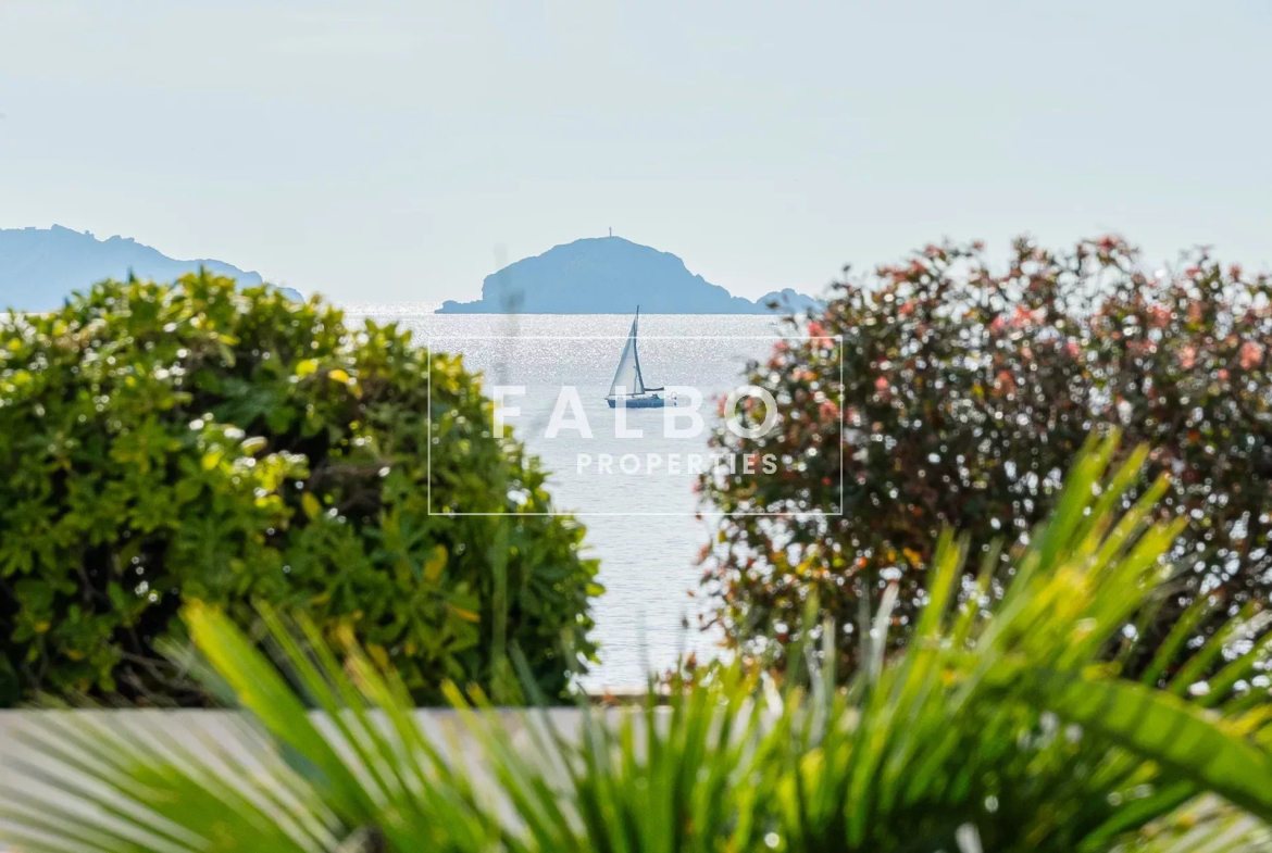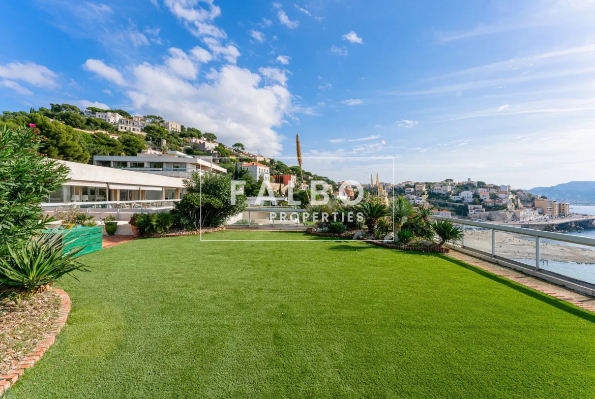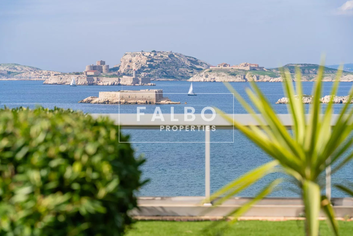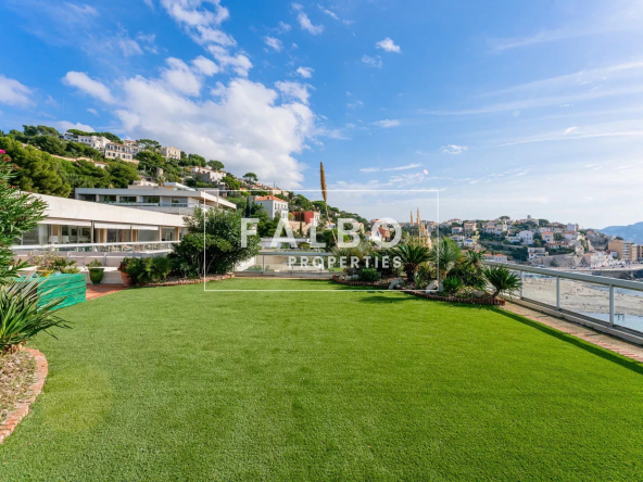 Très rare à la vente, telle une villa sur le toit, penthouse de 182 m2 avec un vaste séjour très largement ouvert par des baies surplombant la mer et la rade de Marseille, prolongé par un jardin suspendu d’environ 500 M2.