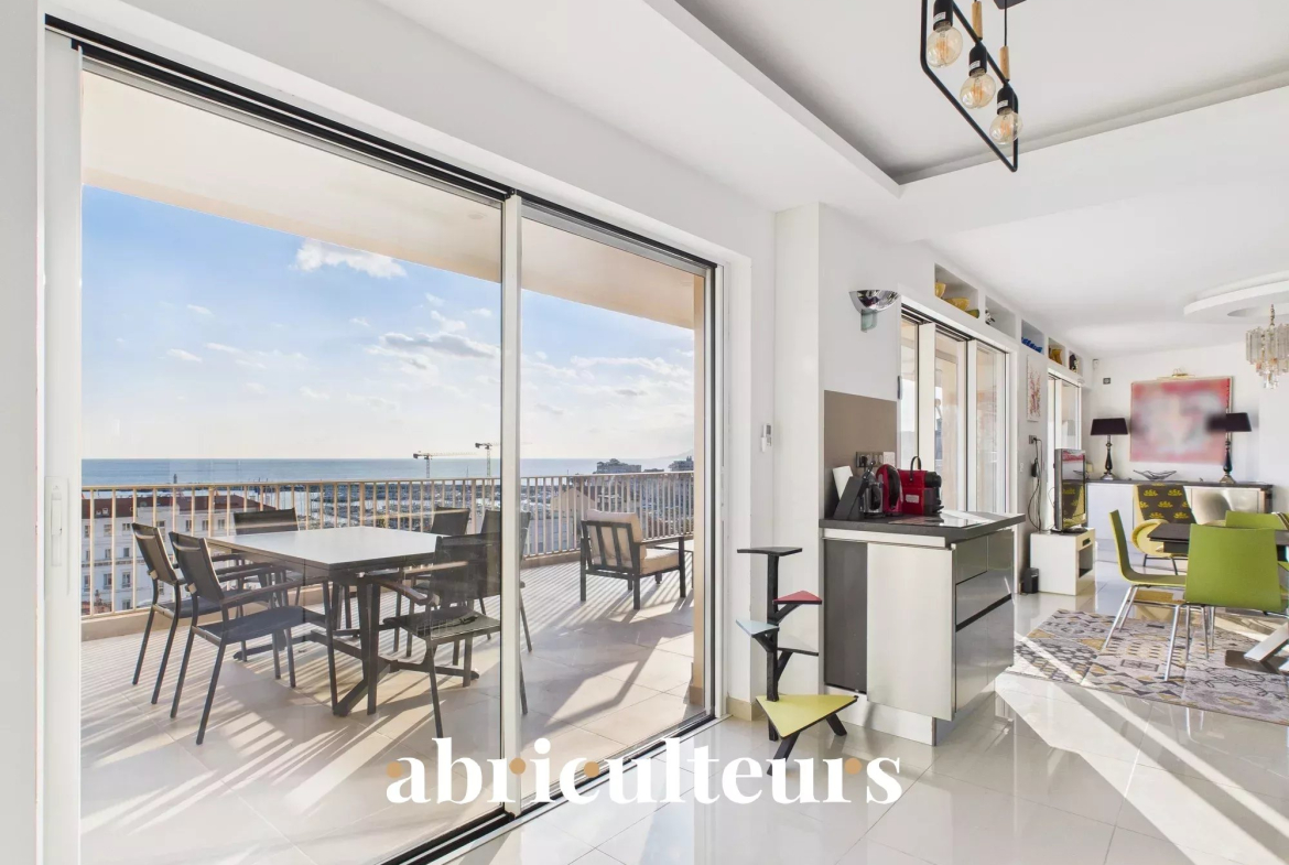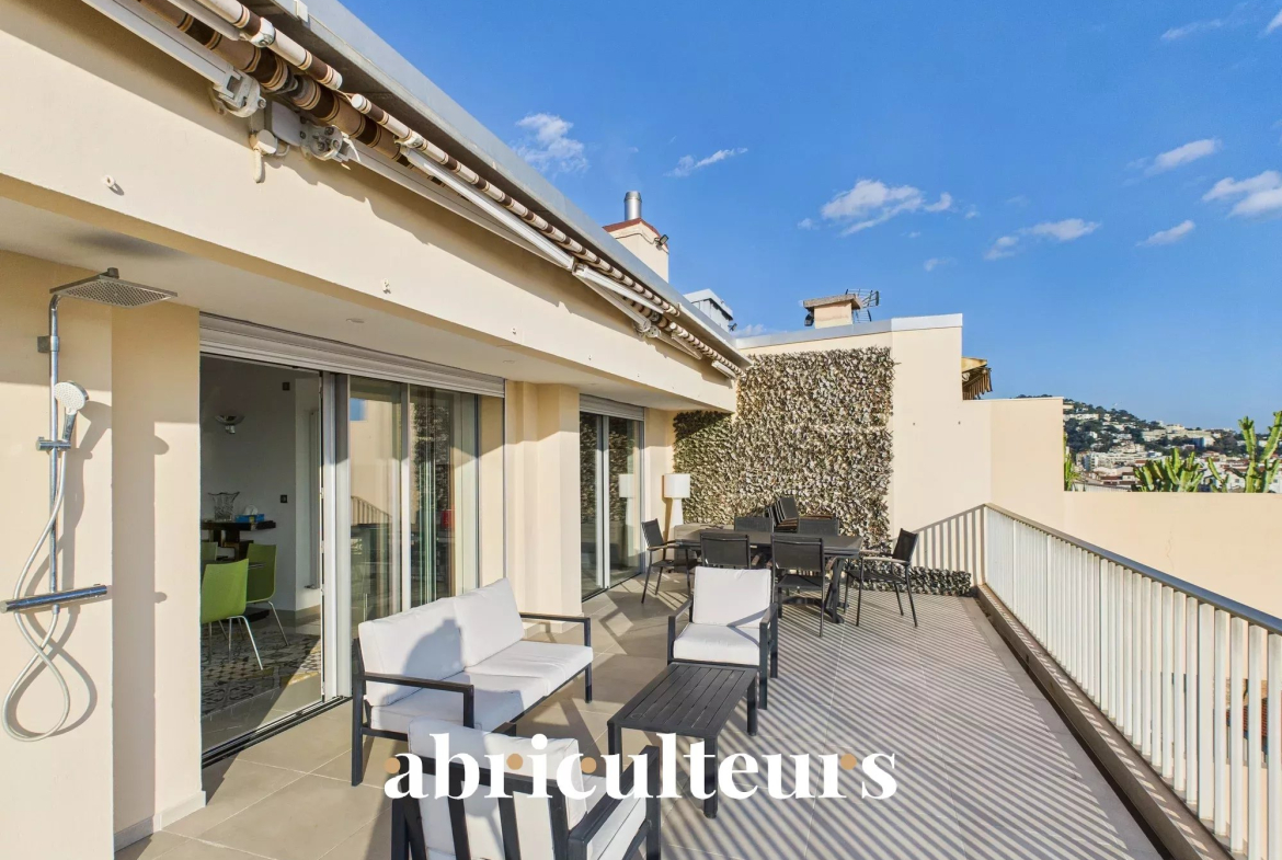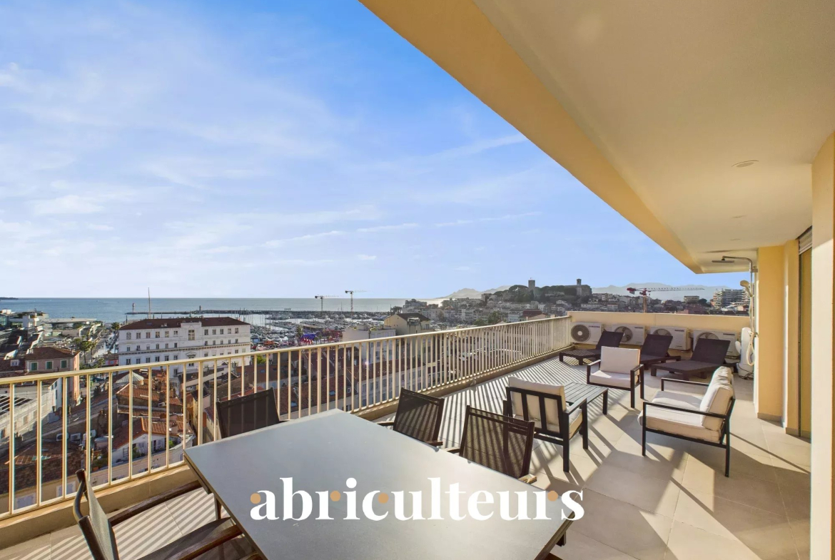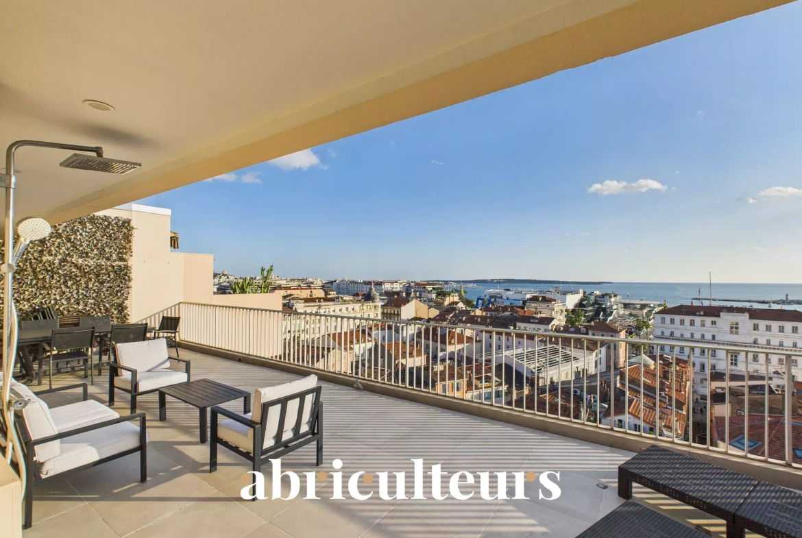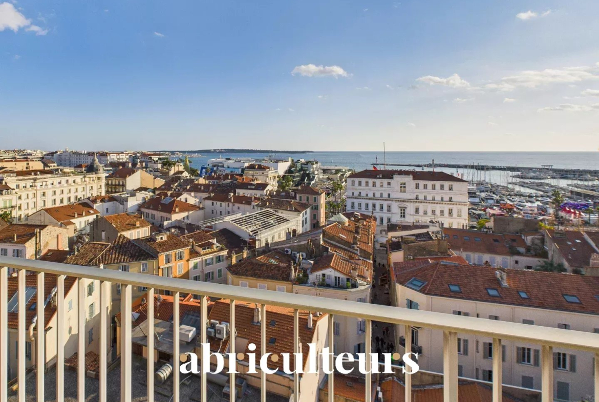 Le bien bénéficie de 86 m² de terrasses, dont 46 m² exposés plein sud, offrant des vues dégagées sur la mer, le Vieux Port et les toits de Cannes.