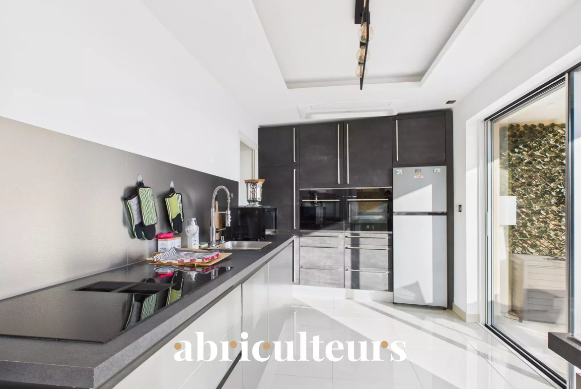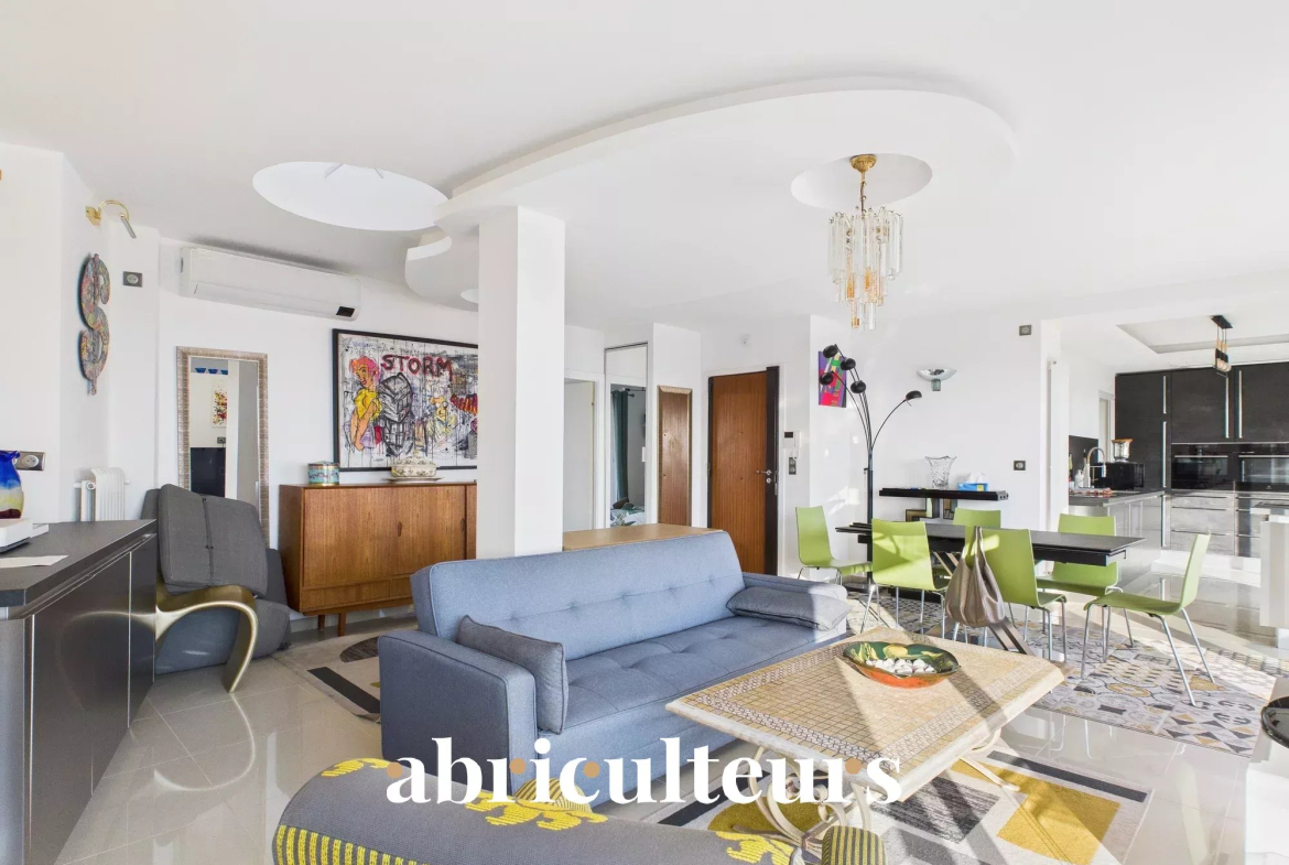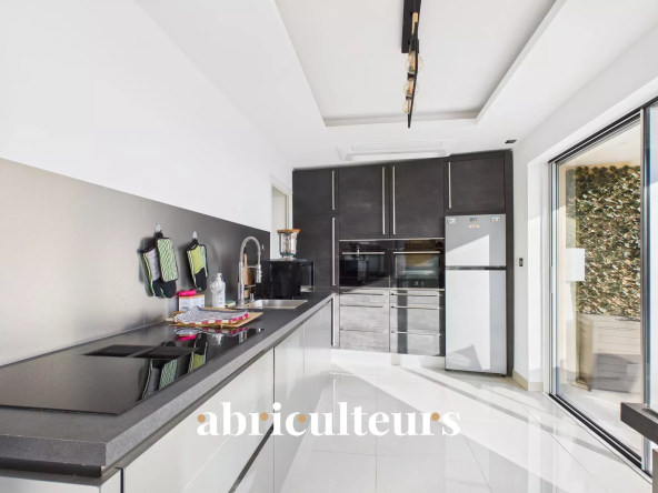 L’appartement s’ouvre sur un séjour lumineux, bénéficiant d’une exposition traversante Sud / Nord, avec une cuisine semi-ouverte entièrement équipée, offrant un accès direct à une des terrasses.