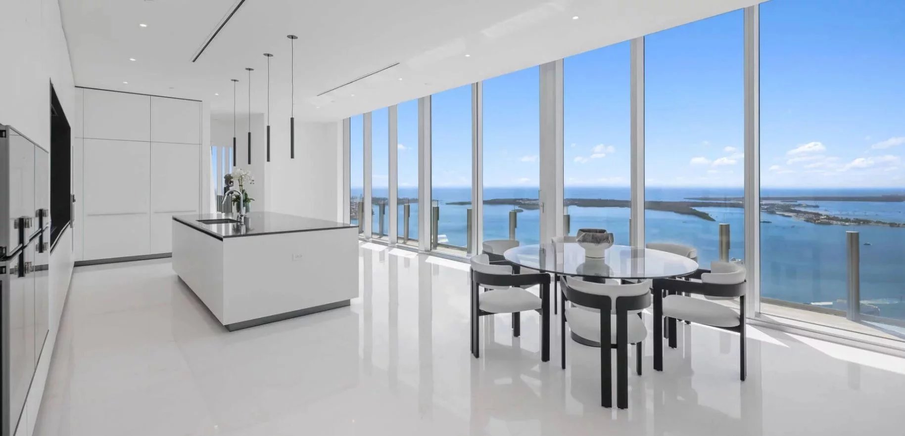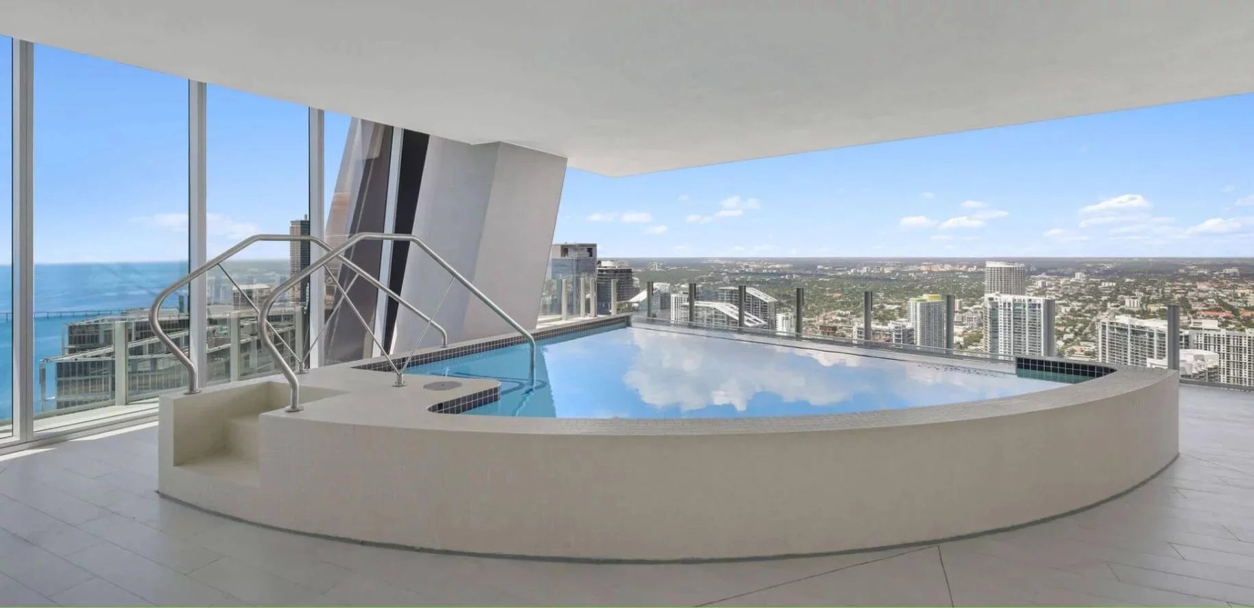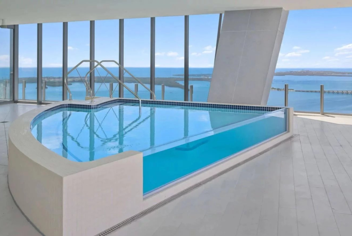 Les vues panoramiques à 360 degrés embrassent la skyline de Miami, la baie de Biscayne et l’océan Atlantique, offrant un spectacle permanent depuis les espaces de réception comme depuis les terrasses. La piscine et le spa privatifs prolongent naturellement les espaces de vie vers l’extérieur, dans un esprit résolument exclusif.