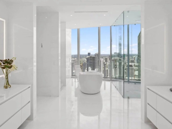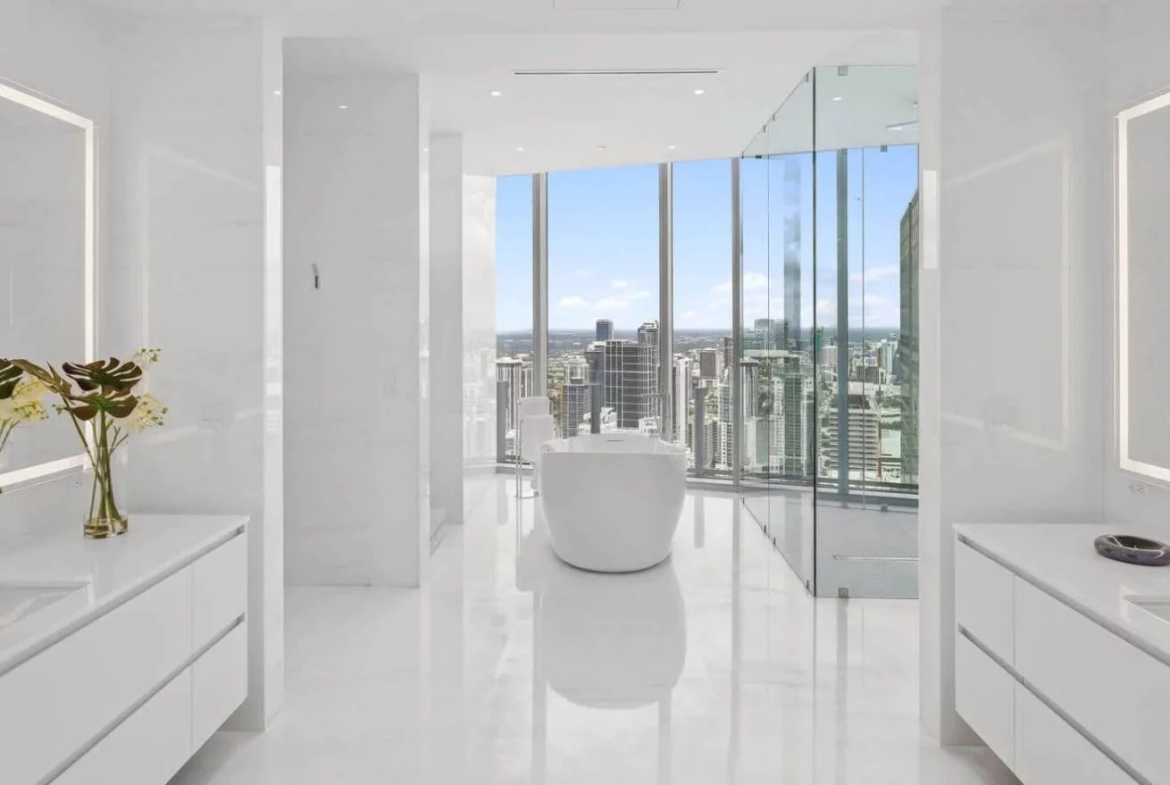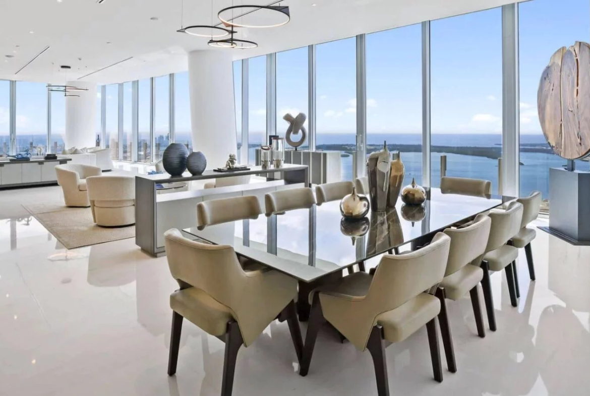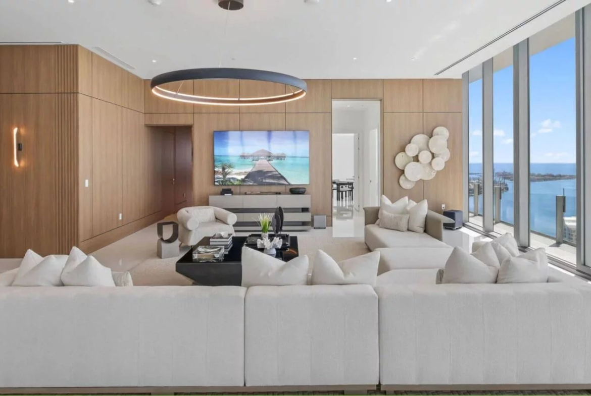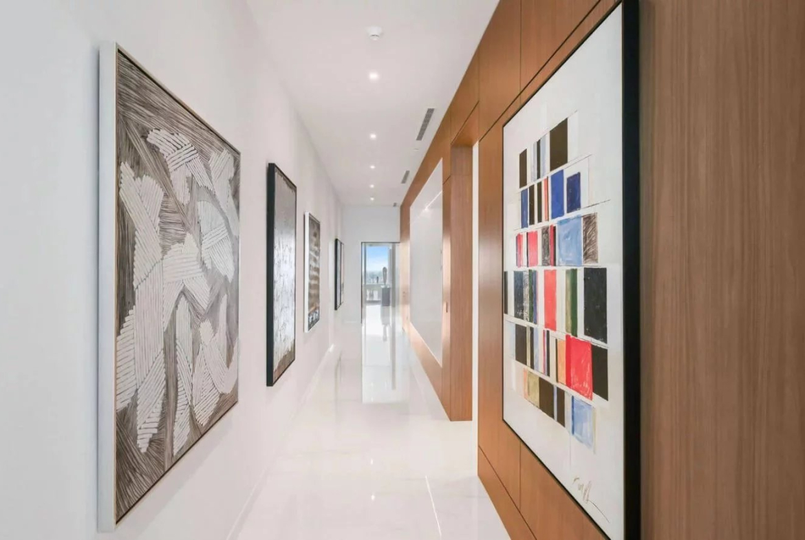 Les espaces intérieurs se distinguent par une conception ouverte baignée de lumière naturelle, sublimée par des plafonds atteignant 3,65 mètres de hauteur et des sols en marbre luxueux. Le penthouse comprend quatre suites, six salles de bains, une chambre de service, une salle de fitness privée, un bar, un office ainsi qu’un hall d’entrée entièrement privatif. Le mobilier sur mesure et les œuvres d’art sélectionnées confèrent à l’ensemble une atmosphère raffinée et immédiatement habitable.