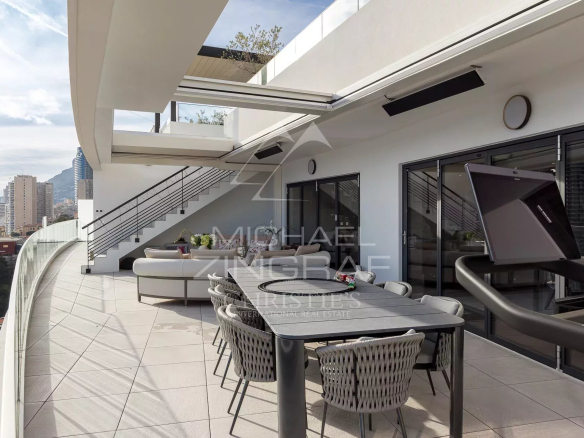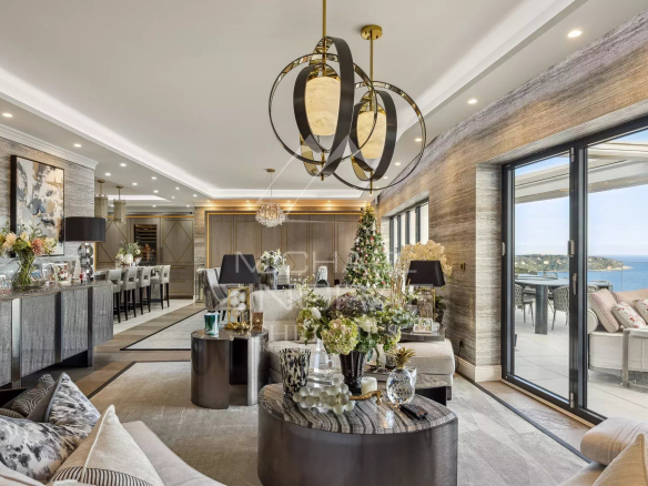 Ce sublime appartement d’environ 209 m2, avec un solarium en toit terrasse de 320m2, avec jardin et très grand jacuzzi, dispose d’un séjour lumineux, réception et salon ouvrant sur une grande terrasse avec une exceptionnelle vue mer et sur Monaco, et une cuisine entièrement équipée et aménagée avec goût. L’espace nuit comprend trois chambres, dont deux ouvrant sur la terrasse, avec chacune leurs salles de bains/douche.