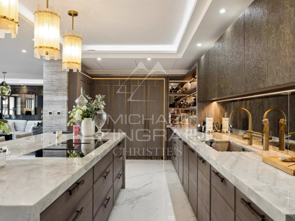 Prestations luxueuses et matériaux nobles, cet appartement est équipé de climatisation réversible, volets électriques, deux garages sous terrain.