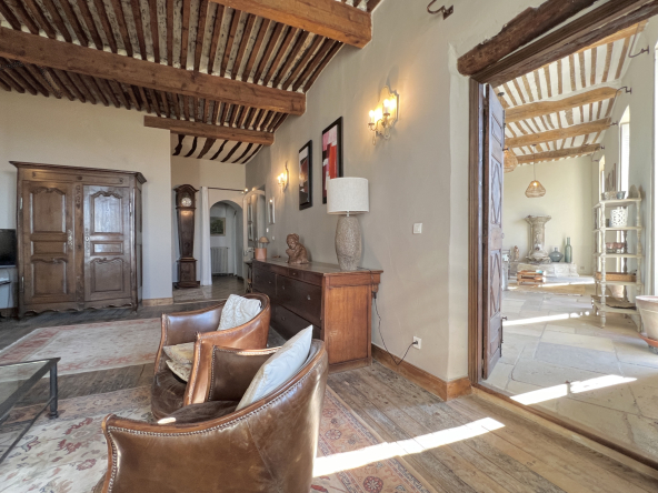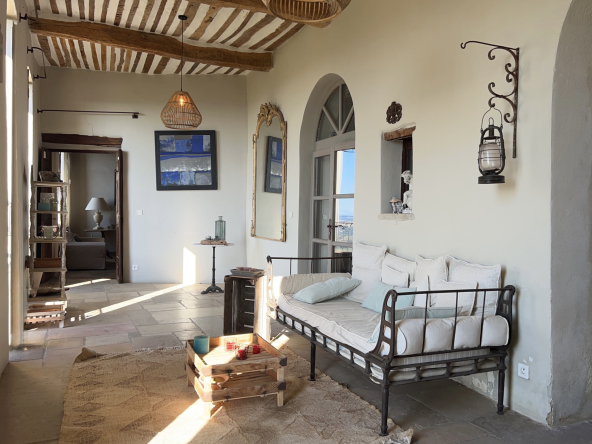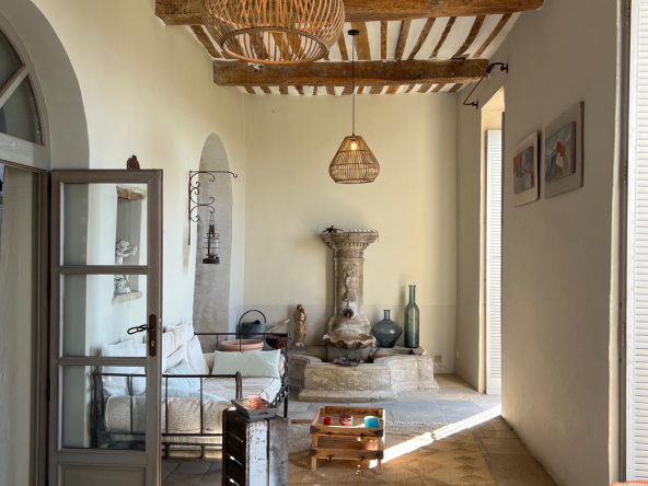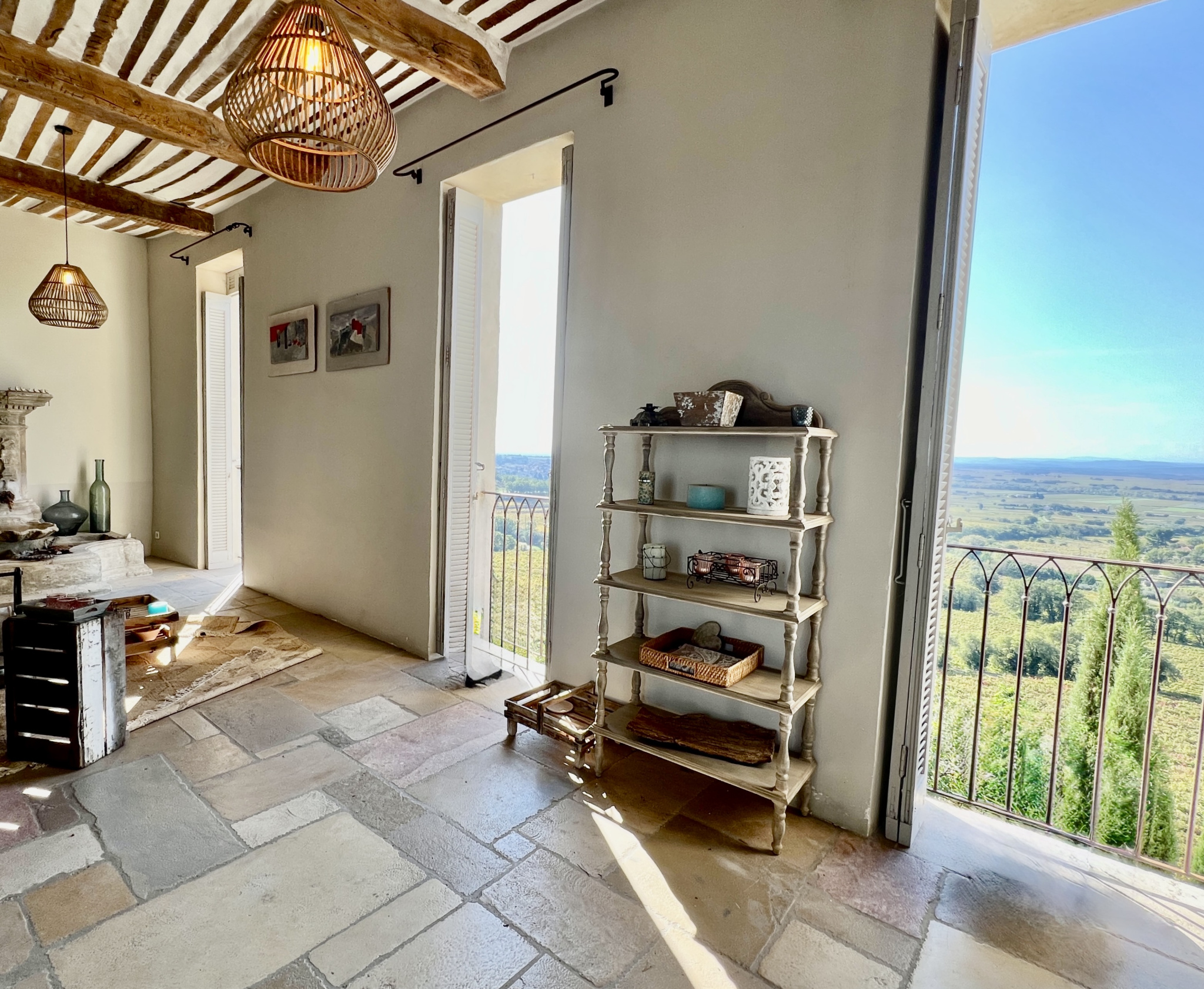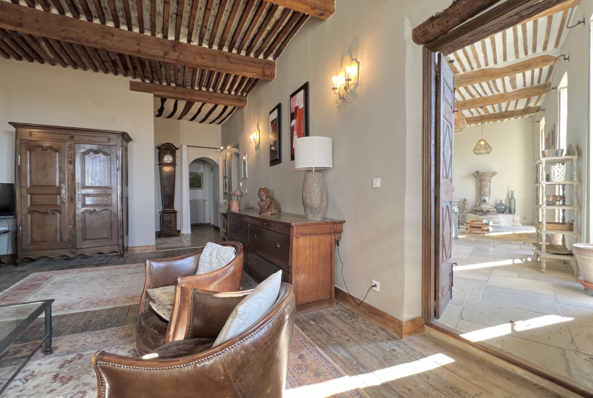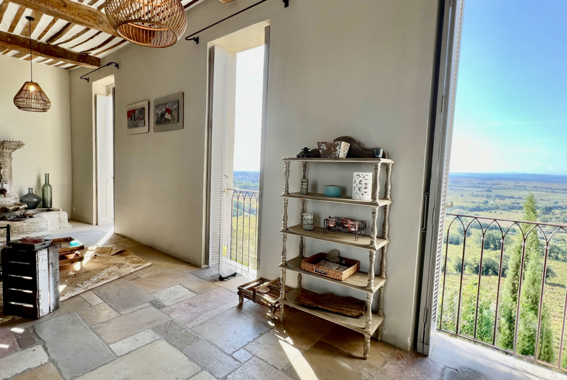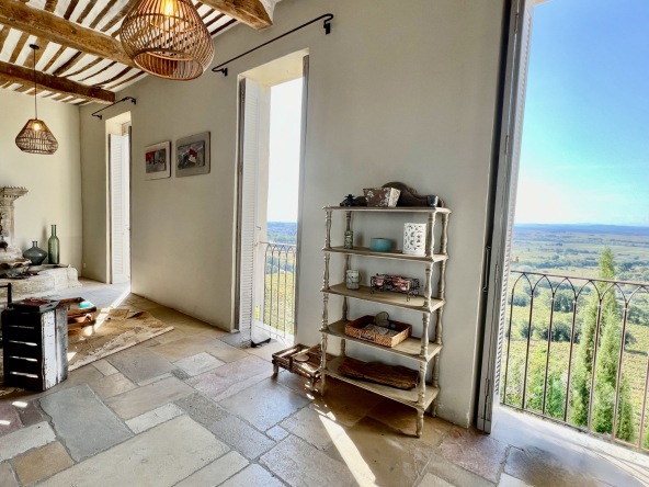 L’espace de réception de 42 m2, à l’ambiance feutrée, agrémenté d’une cheminée et de magnifiques plafonds à la française, offre un cadre idéal pour des soirées conviviales et chaleureuses. La hauteur sous plafond accentue la générosité de l’espace. La loggia, baignée de lumière, semble suspendue entre terre et ciel. Chaque rayon de soleil vient révéler la douceur intemporelle de ce refuge, tandis qu’une fontaine en pierre ajoute une touche de poésie au décor. Les persiennes de la loggia s’ouvrent sur un panorama époustouflant, véritable tableau vivant, où vignobles et vallons se fondent à l’horizon. Cet espace inspirant invite à la contemplation, à la lecture ou à savourer un apéritif ou un dîner en face de ce spectacle naturel.