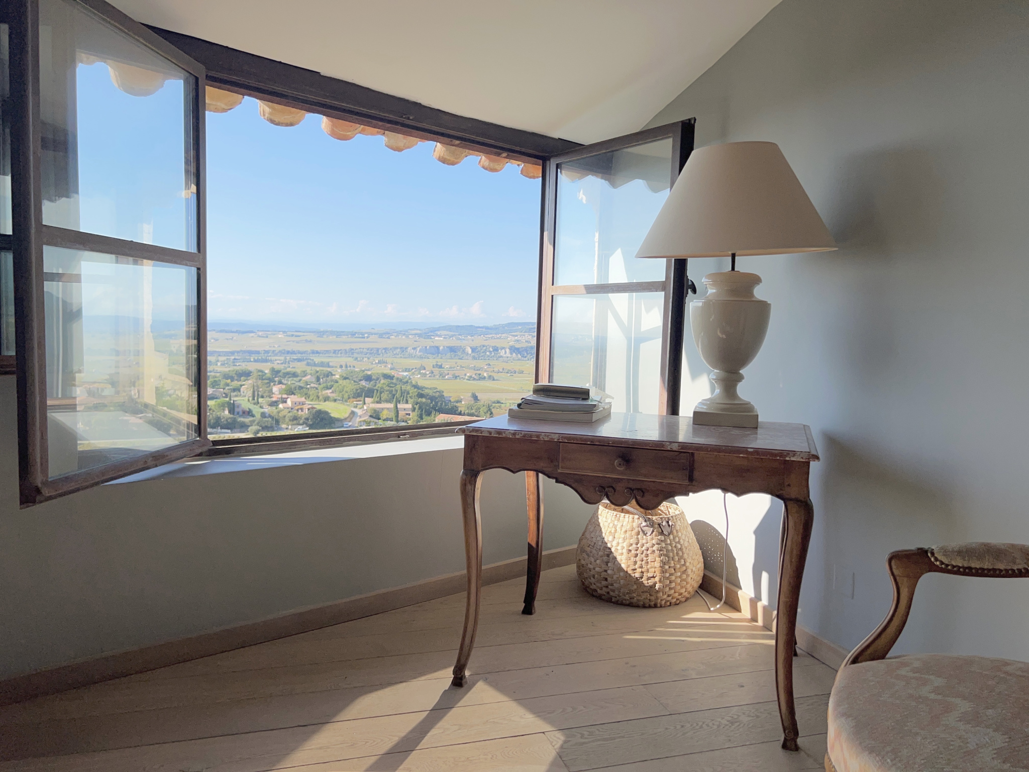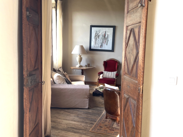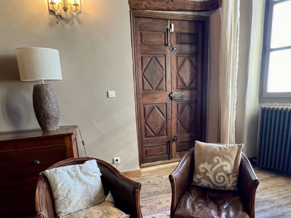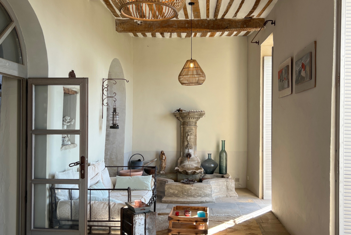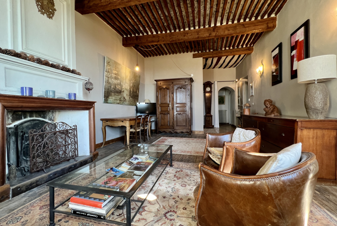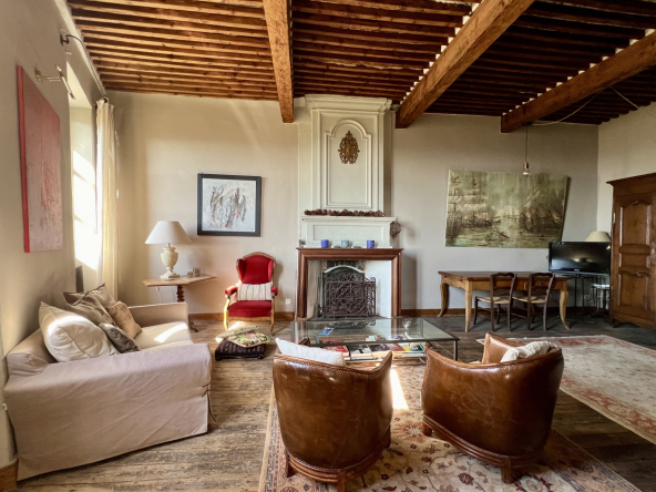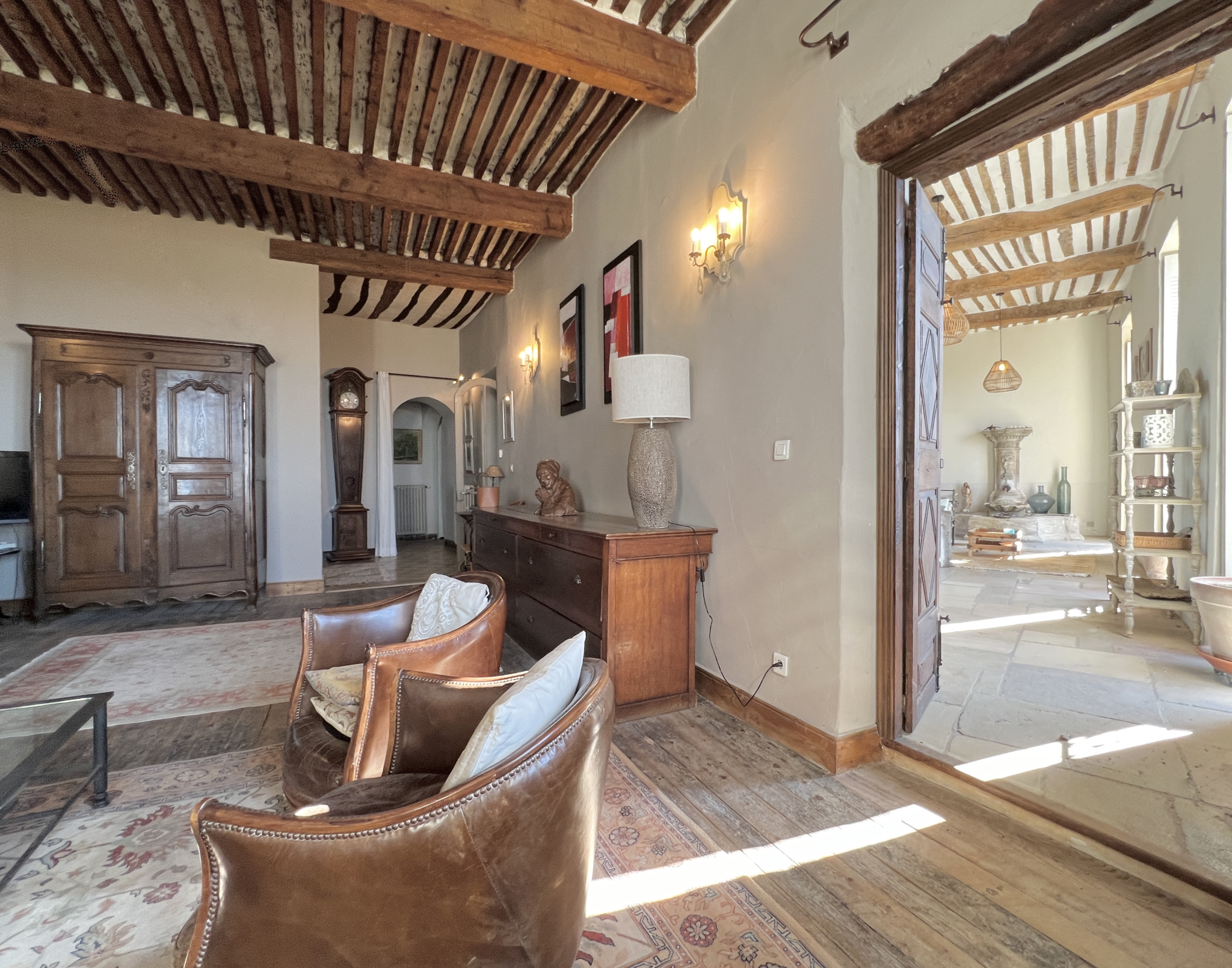 L’espace de réception de 42 m2, à l’ambiance feutrée, agrémenté d’une cheminée et de magnifiques plafonds à la française, offre un cadre idéal pour des soirées conviviales et chaleureuses. La hauteur sous plafond accentue la générosité de l’espace. La loggia, baignée de lumière, semble suspendue entre terre et ciel. Chaque rayon de soleil vient révéler la douceur intemporelle de ce refuge, tandis qu’une fontaine en pierre ajoute une touche de poésie au décor. Les persiennes de la loggia s’ouvrent sur un panorama époustouflant, véritable tableau vivant, où vignobles et vallons se fondent à l’horizon. Cet espace inspirant invite à la contemplation, à la lecture ou à savourer un apéritif ou un dîner en face de ce spectacle naturel.