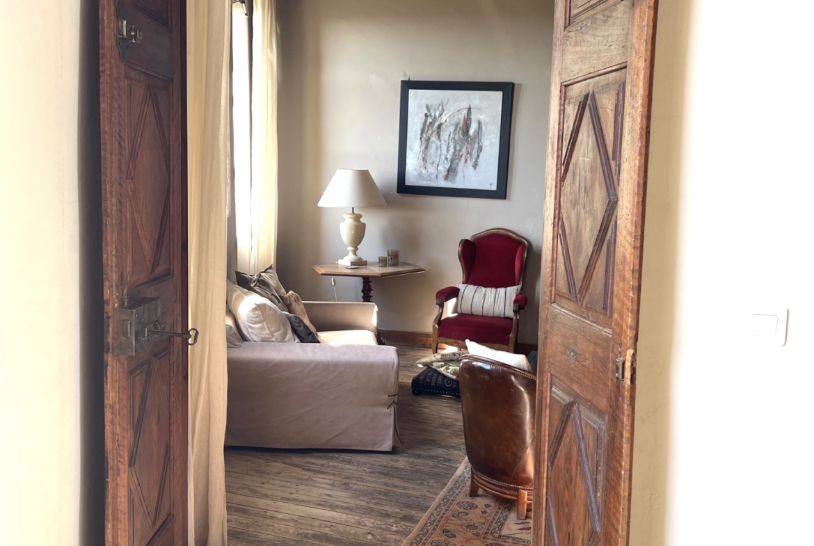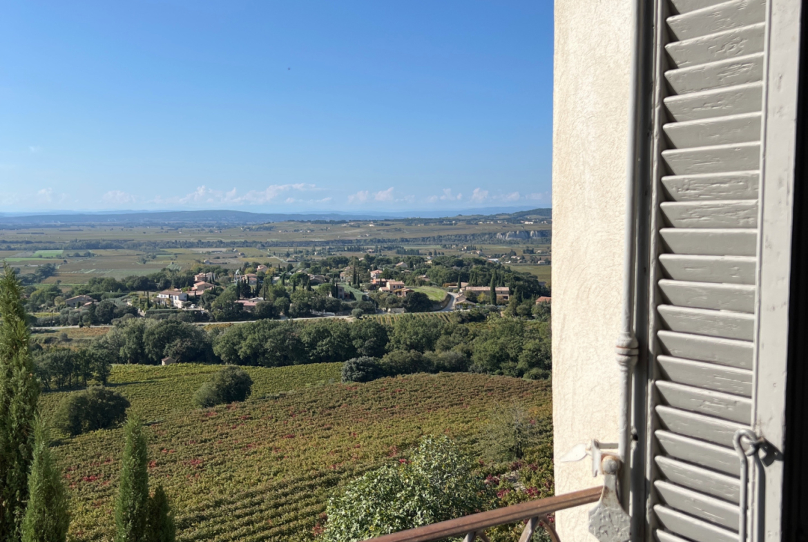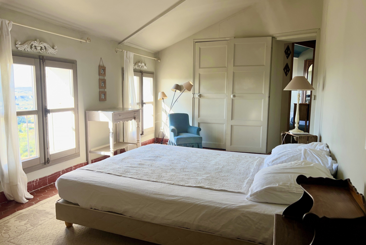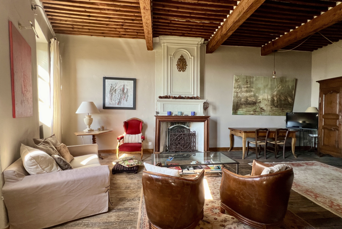 L’espace de réception de 42 m2, à l’ambiance feutrée, agrémenté d’une cheminée et de magnifiques plafonds à la française, offre un cadre idéal pour des soirées conviviales et chaleureuses. La hauteur sous plafond accentue la générosité de l’espace. La loggia, baignée de lumière, semble suspendue entre terre et ciel. Chaque rayon de soleil vient révéler la douceur intemporelle de ce refuge, tandis qu’une fontaine en pierre ajoute une touche de poésie au décor. Les persiennes de la loggia s’ouvrent sur un panorama époustouflant, véritable tableau vivant, où vignobles et vallons se fondent à l’horizon. Cet espace inspirant invite à la contemplation, à la lecture ou à savourer un apéritif ou un dîner en face de ce spectacle naturel.