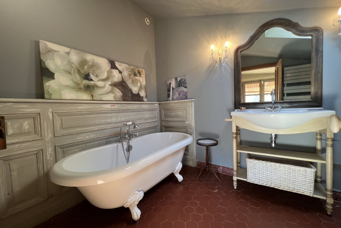 La maison dispose également d’une salle de bain avec baignoire sabot, rappelant le charme d’antan, et d’une salle d’eau, offrant confort et fonctionnalité. Une terrasse intimiste de 15 m2, ouverte sur la colline, invite à savourer chaque rayon de soleil dans une quiétude absolue.