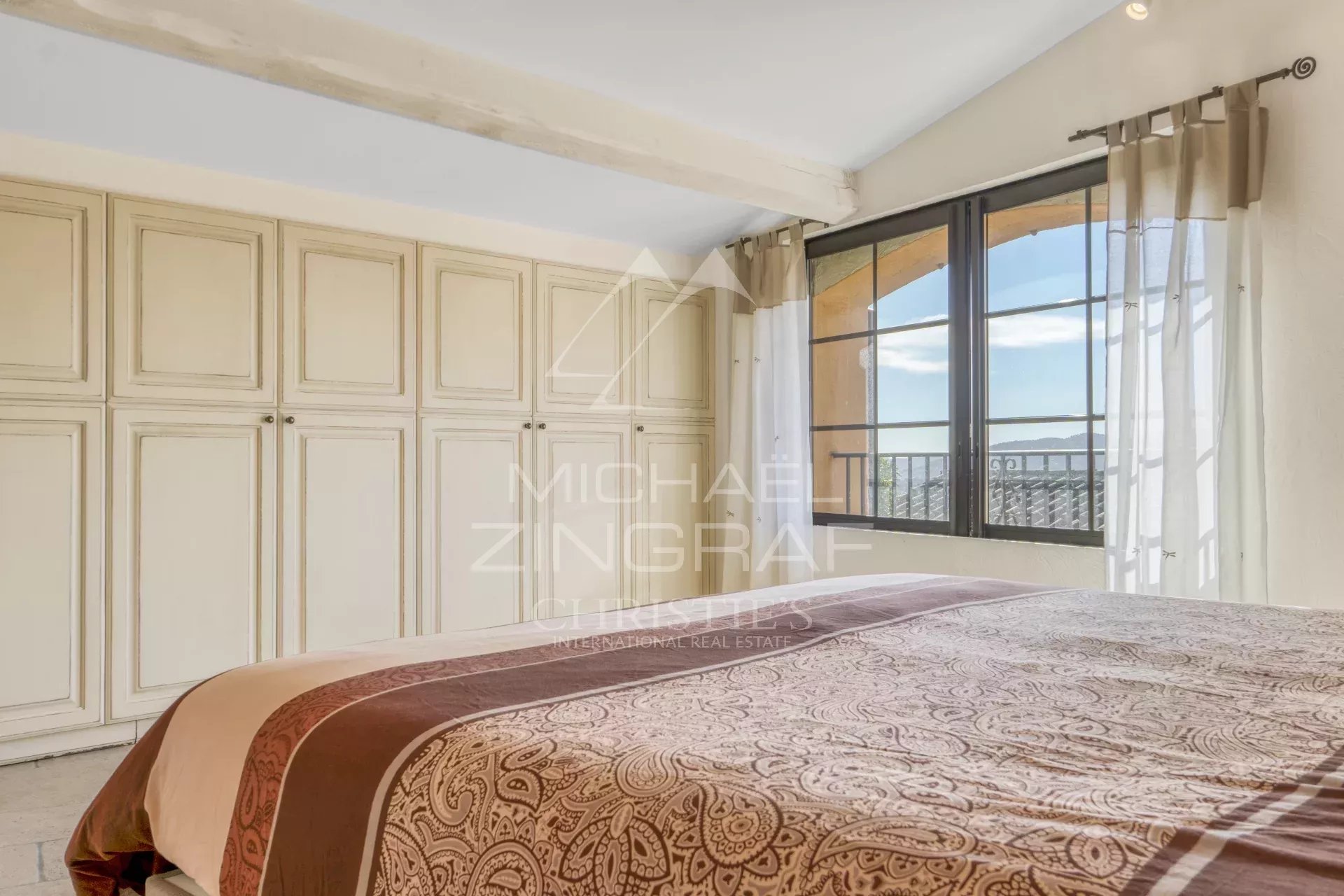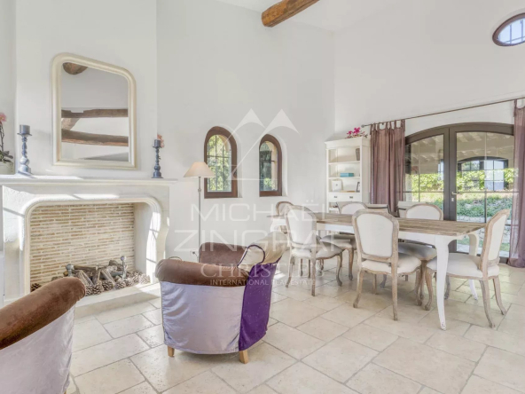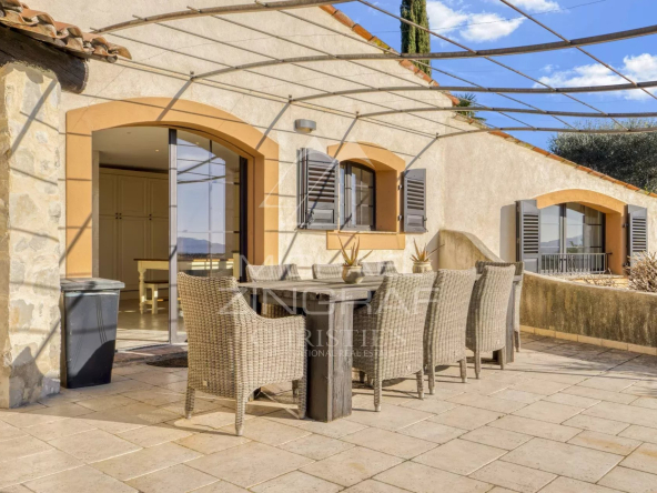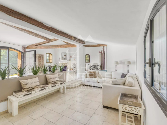 Entièrement rénovée, elle offre un très beau séjour avec cheminée et une grande cuisine ouvrant sur une terrasse, une belle suite de maître, un bureau avec terrasse tropezienne à l’étage et en rez de jardin, deux autres suites invités.