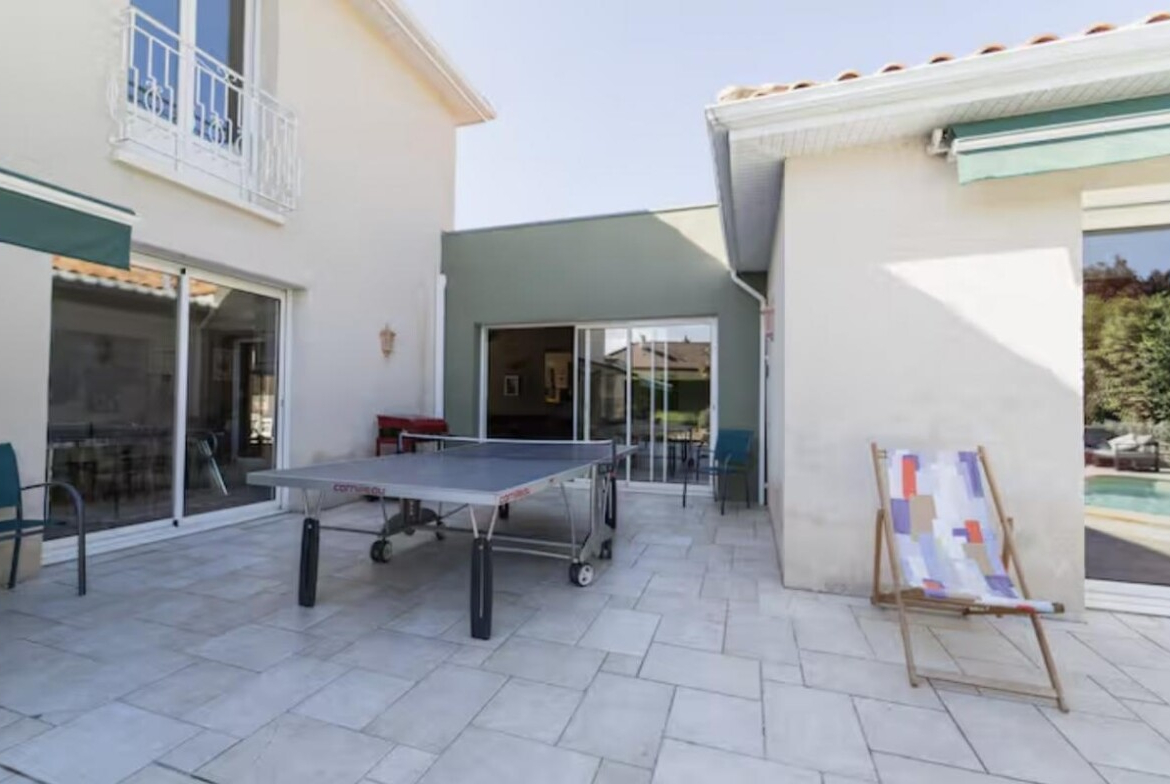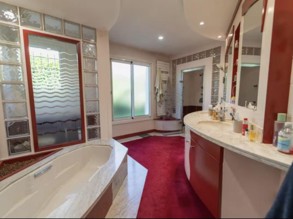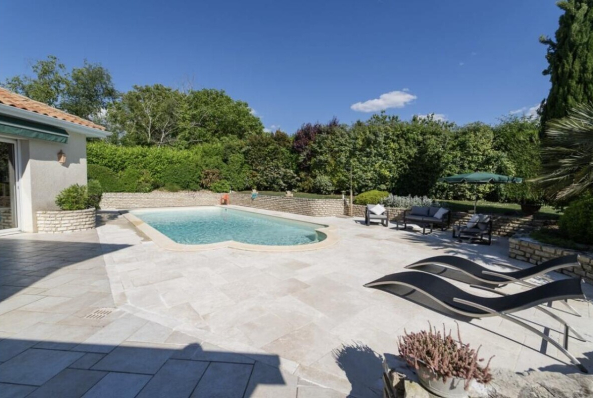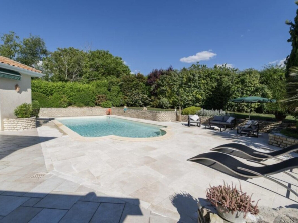À l’extérieur, le cadre est propice à la détente : une piscine chauffée au sel (10×5 m), parfaitement intégrée dans un jardin paysagé, invite aux beaux jours. Un garage chauffé donne un accès direct à la buanderie du rez-de-chaussée, renforçant le côté pratique.