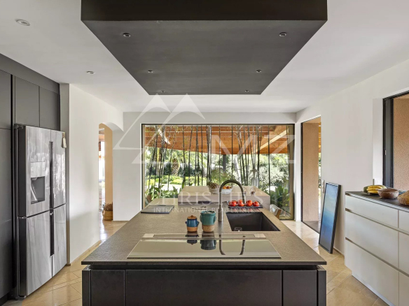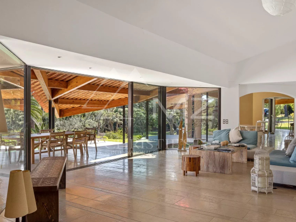 Déployée sur près de 4400m2 de jardins, elle offre une large pièce de réception avec vue mer, une salle à manger avec une cuisine équipée, et 5 chambres. grand bureau.