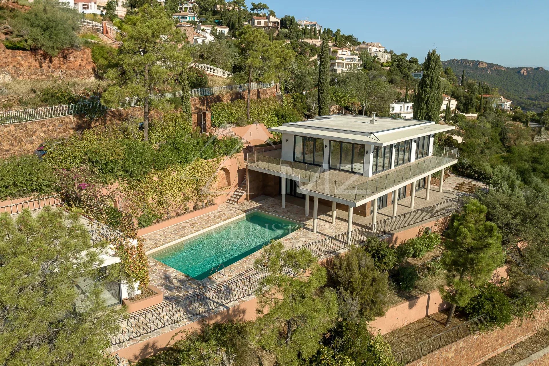 Située à la sortie de Théoule dans un domaine sécurisé fermée dominant la baie et l’Estérel, villa moderne entièrement rénovée sur 2 niveaux d’une surface totale bâtie d’environ 210 M2 sur terrain avec piscine, offrant une vue mer extraordinaire. Au calme et exposée plein sud, la propriété dispose de 4 chambres dont un studio indépendant. Les plages et les restaurants du Port de La Figueirette sont à 5 minutes. Thèoule centre à 10 minutes, Cannes Croisette à 35 minutes et à 45 minutes de l’Aéroport de Nice. Emotion garantie !