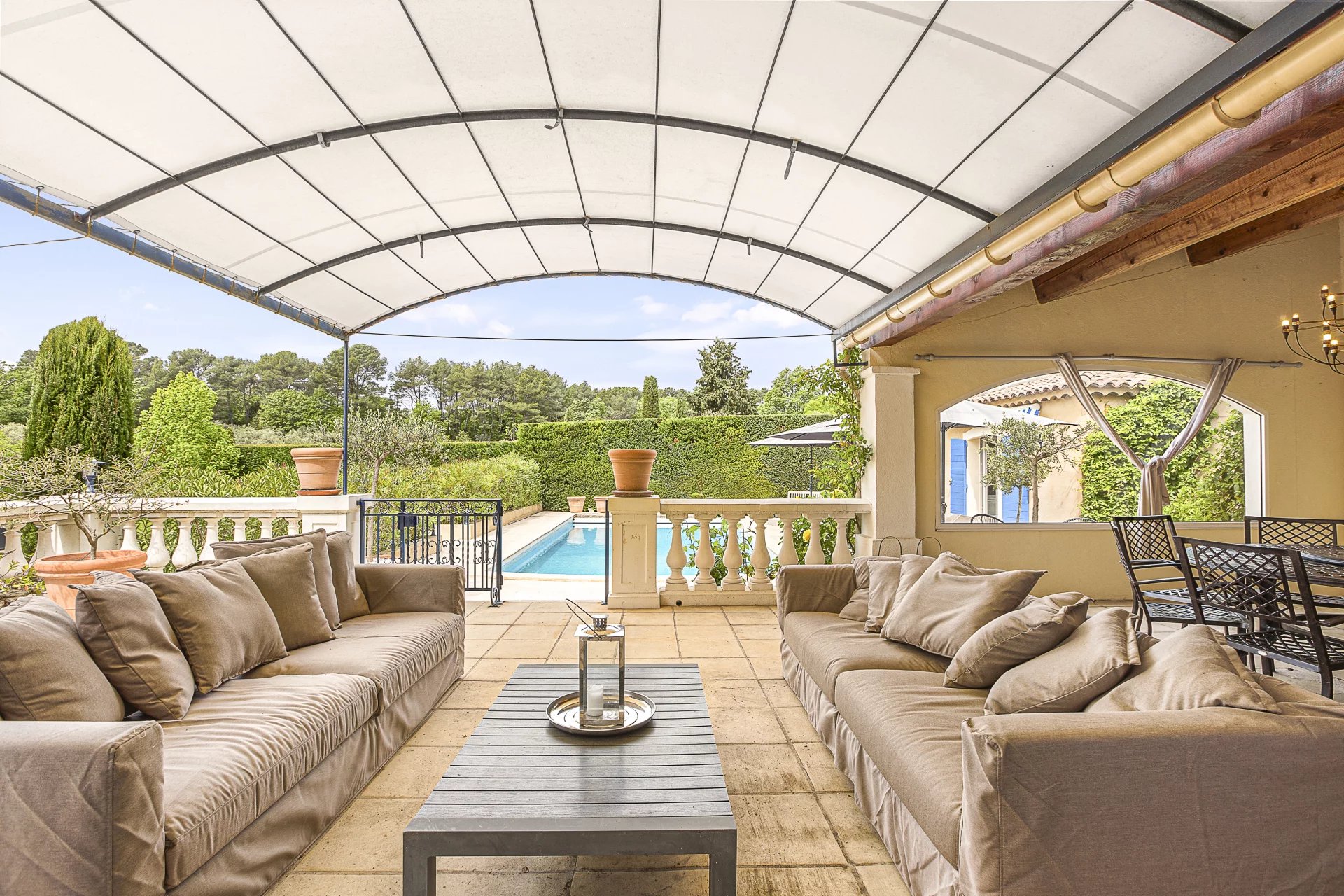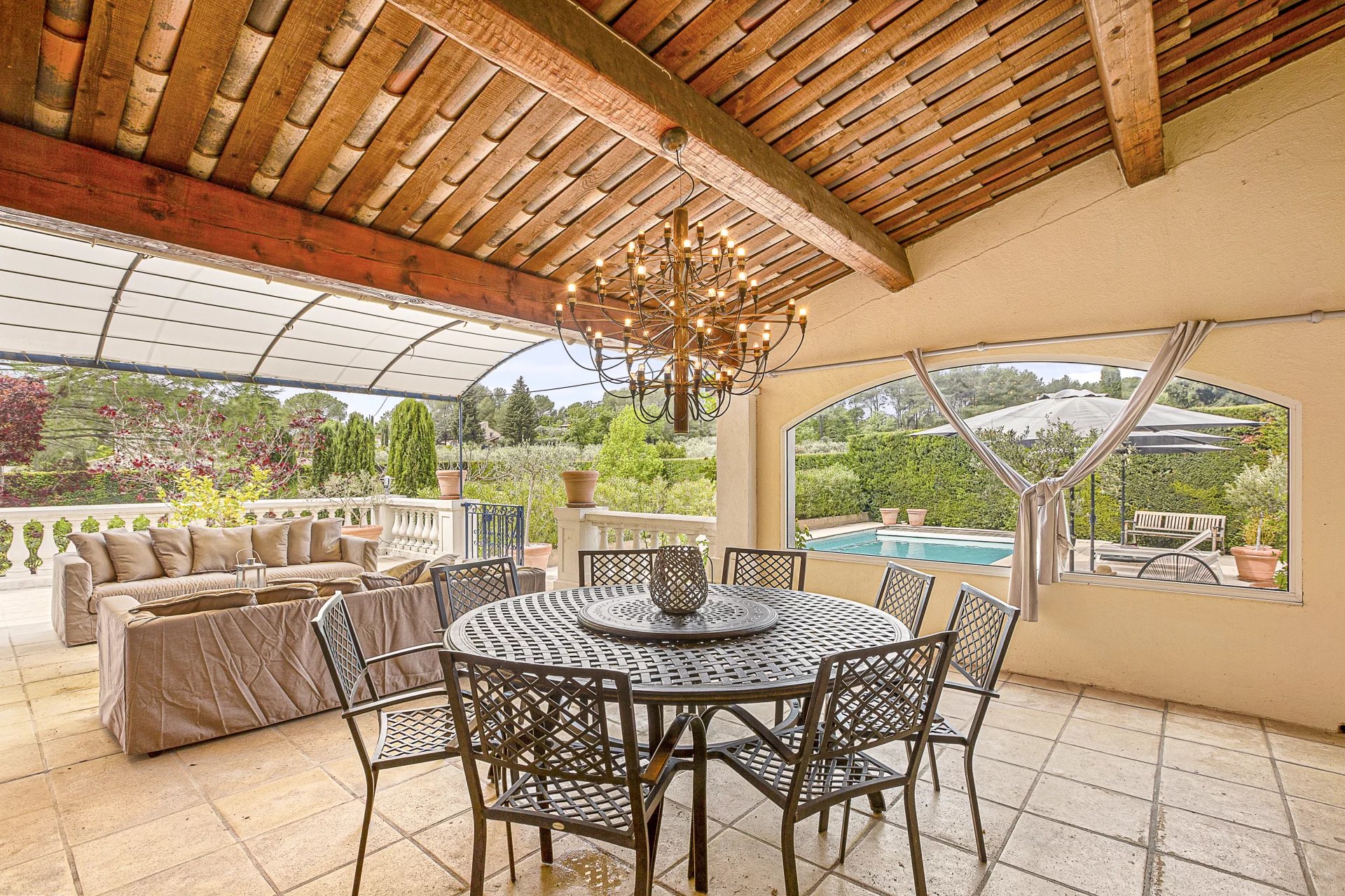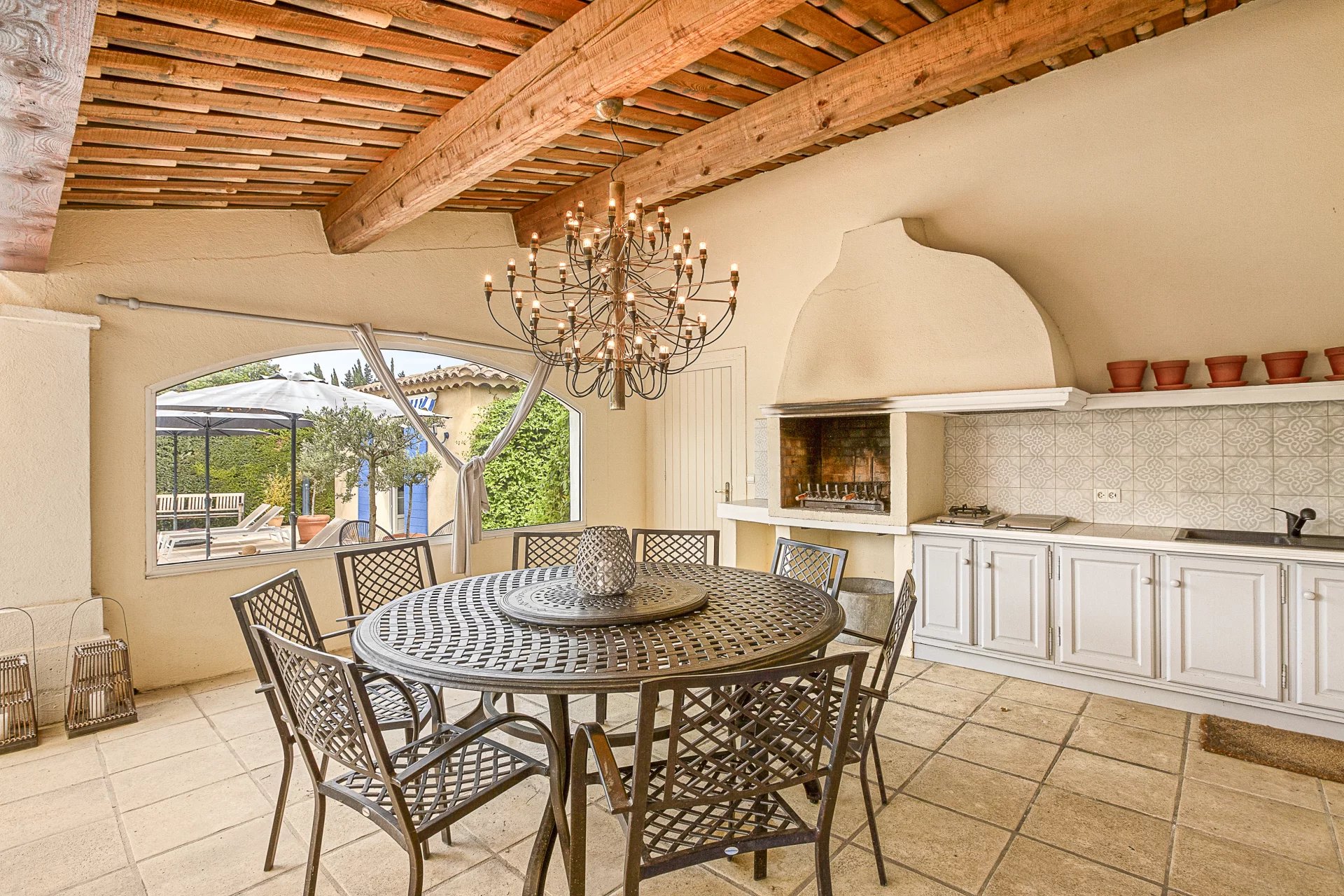 Le jardin arboré, entièrement clôturé, offre tout l’art de vivre provençal : une piscine chauffée au sel avec douche extérieure, plusieurs terrasses pour se détendre ou partager des repas, un terrain de boules, un terrain de volley-ball ainsi que des oliviers permettant de produire sa propre huile d’olive.