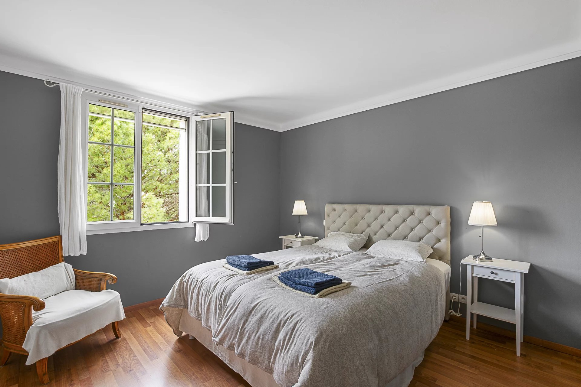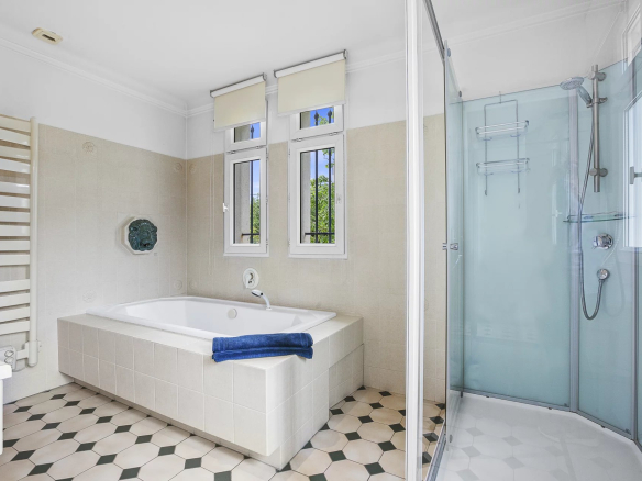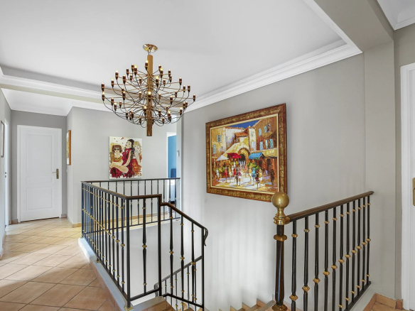 Au même niveau se trouvent également : un double garage (35 m²), une buanderie, une salle de sport et de nombreuses pièces de rangement. Un bel escalier en fer forgé mène à l’étage, où se trouvent quatre chambres, deux salles de bains, un dressing et des toilettes séparées. Le sous-sol abrite une cave à vin intime.