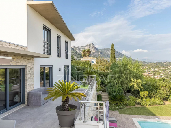 Située en position dominante, cette belle propriété récente de style contemporain entièrement climatisée d’environ 170 m2 habitables bénéfice d’une vue mer.