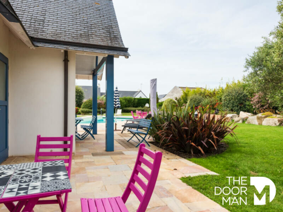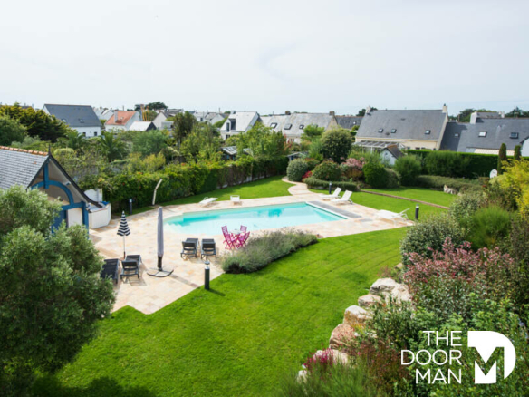 Sur la commune du CROISIC à deux pas du centre ville, au calme dans un quartier résidentiel et paisible. Exceptionnelles villas entièrement rénovées avec des matériaux d’excellentes factures. Cet ensemble de deux habitations avec annexes, permet d’acceuillir une à deux familles ou bien de profiter d’un patrimoine pouvant être mis à disposition pour des locations saisonnières par exemple. L’ensemble pourvu d’une très belle piscine, d’un pool house avec cuisine d’été et sa terrasse très agréable sur un terrain clos et paysagé de 1370m2. Concernant la demeure principale elle comprend une entrée donnant sur un vaste séjour-salon et cuisine équipée (plus de 40m2), une pièce à usage actuel de coin ”TV” équipé peut aussi servir de chambre ou de bureau, un wc et un dressing sont dans son prolongement ; une belle salle à manger située dans l’extension moderne aux baies vitrées impressionnantes et donnant accès au jardin ou au sous-sol par un escalier. Au premier étage nous retrouvons deux chambres pourvues d’une salle d’eau et d’un dressing aménagé, une troisième chambre avec rangements donnant tout comme la salle de bains complémentaire au très beau toit terrasse en plancher bois ; au deuxième étage deux chambres et une charmante salle d’eau aux couleurs chaudes. Pour compléter, nous bénéficions d’un garage utile aux véhicules légers, vélos ou autres accessoires (planches par exemples), une chaufferie alimentée au gaz de ville, buanderie, salle de sport, douche et Wc. Préau idéal pour y mettre une table de ping-pong ou l’hivernage du mobilier de jardin. Cour pavée à l’ancienne permettant le stationnement de deux ou trois véhicules.