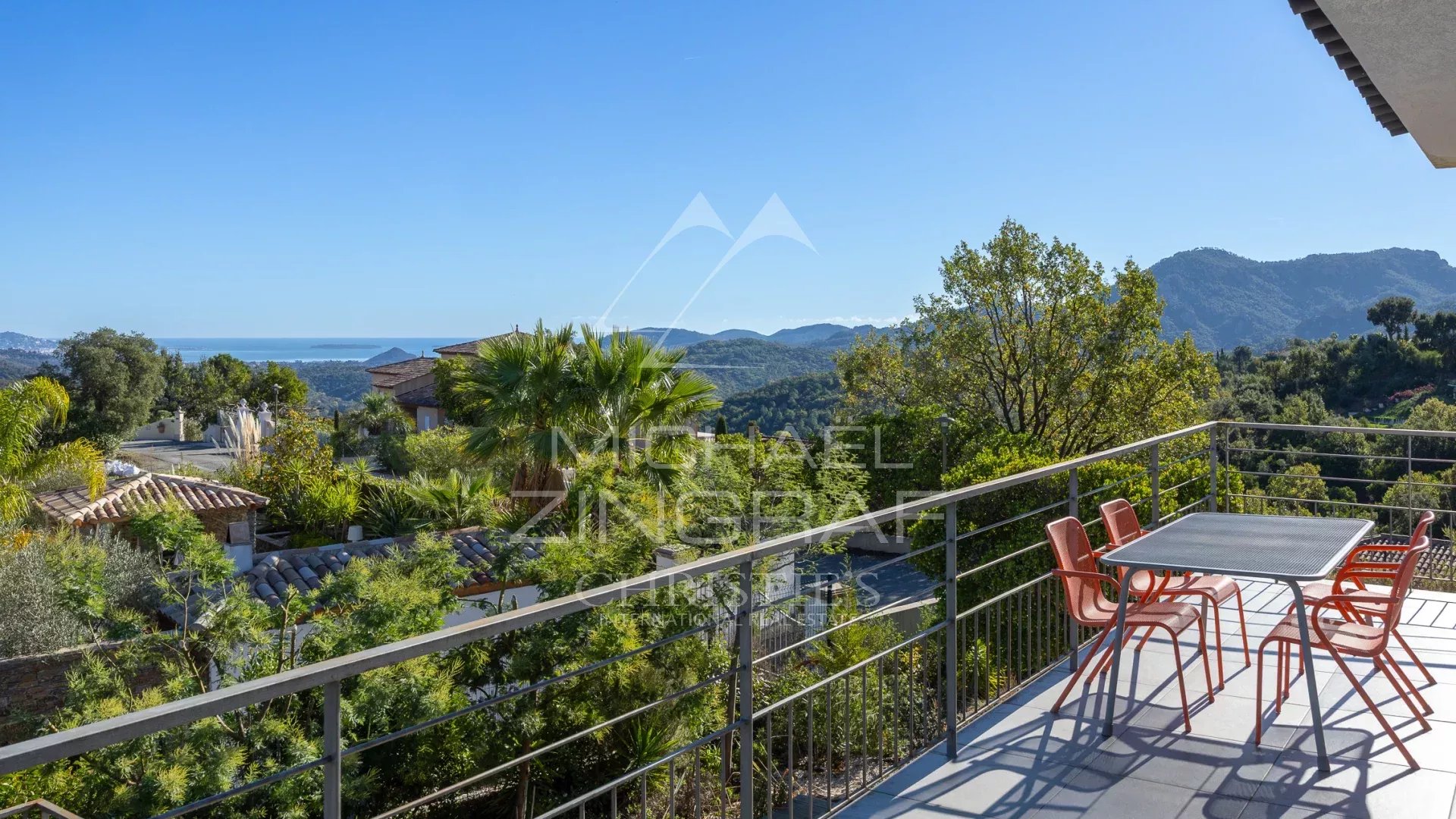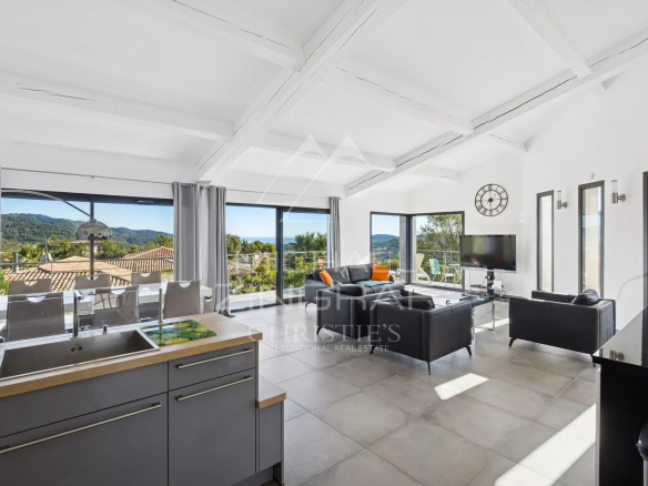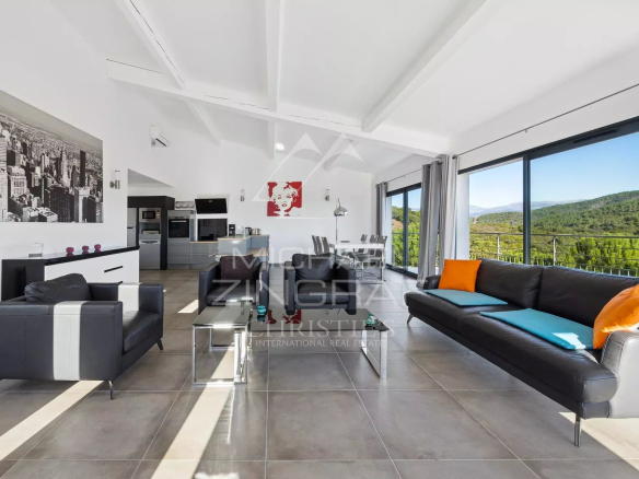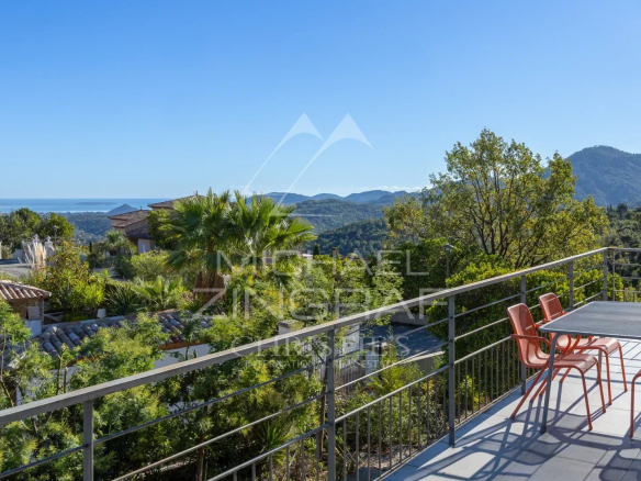 Au cœur d’un domaine privé sécurisé aux Adrets de l’Estérel, en position dominante, dans une impasse, superbe propriété contemporaine d’environ 180m2, avec vue dégagée jusqu’à la mer.