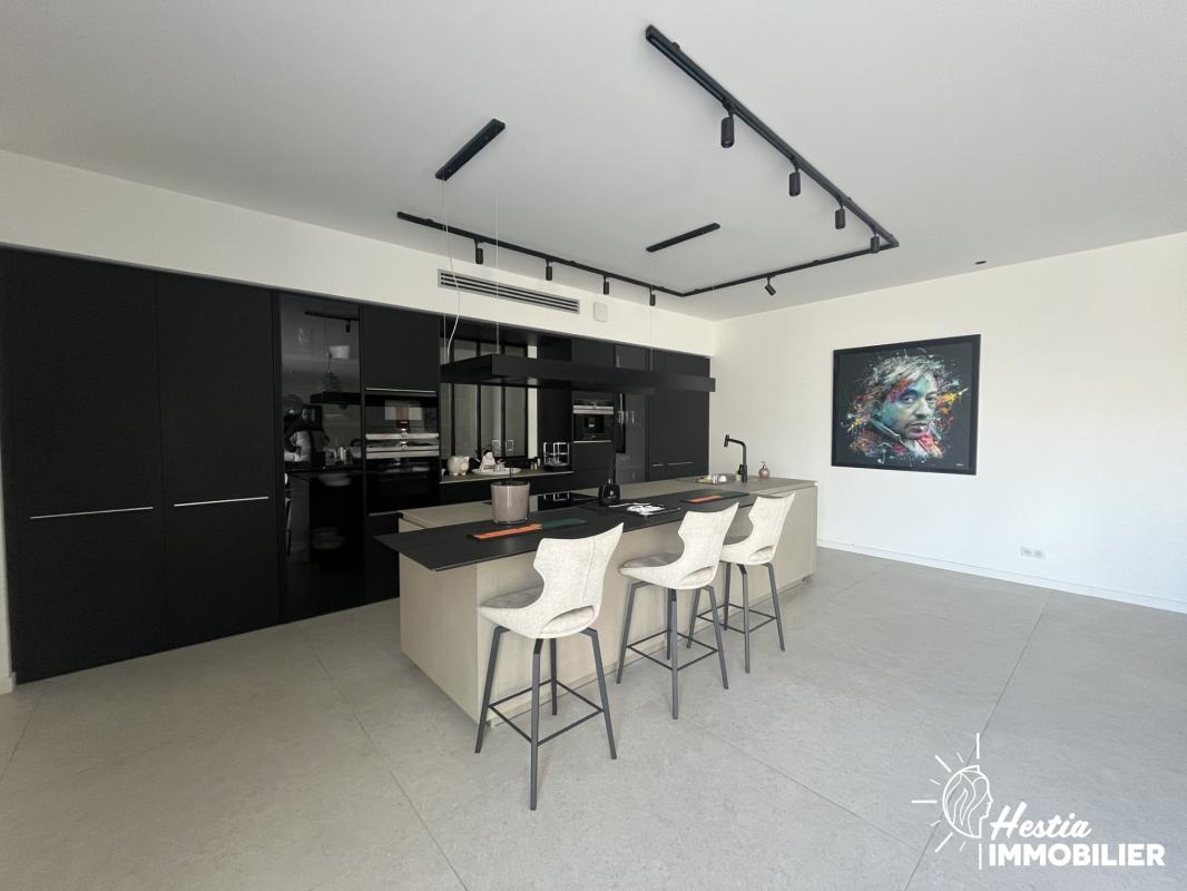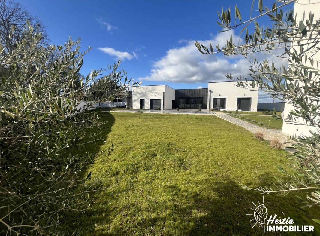 Édifiée en 2024 sur une parcelle paysagée de 1 769 m2, cette somptueuse villa d’architecte de plain-pied séduit par son architecture contemporaine en forme de U, pensée pour offrir lumière, intimité et fluidité des espaces autour de la piscine.