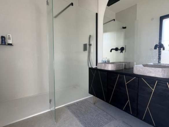 Dès l’entrée, le regard est happé par une pièce de réception de près de 100 m2, baignée de lumière grâce à de larges baies vitrées ouvrant sur la terrasse et la piscine 5 x 10 m. Les volumes généreux et la conception ouverte créent une atmosphère à la fois conviviale et résolument moderne, idéale pour recevoir.