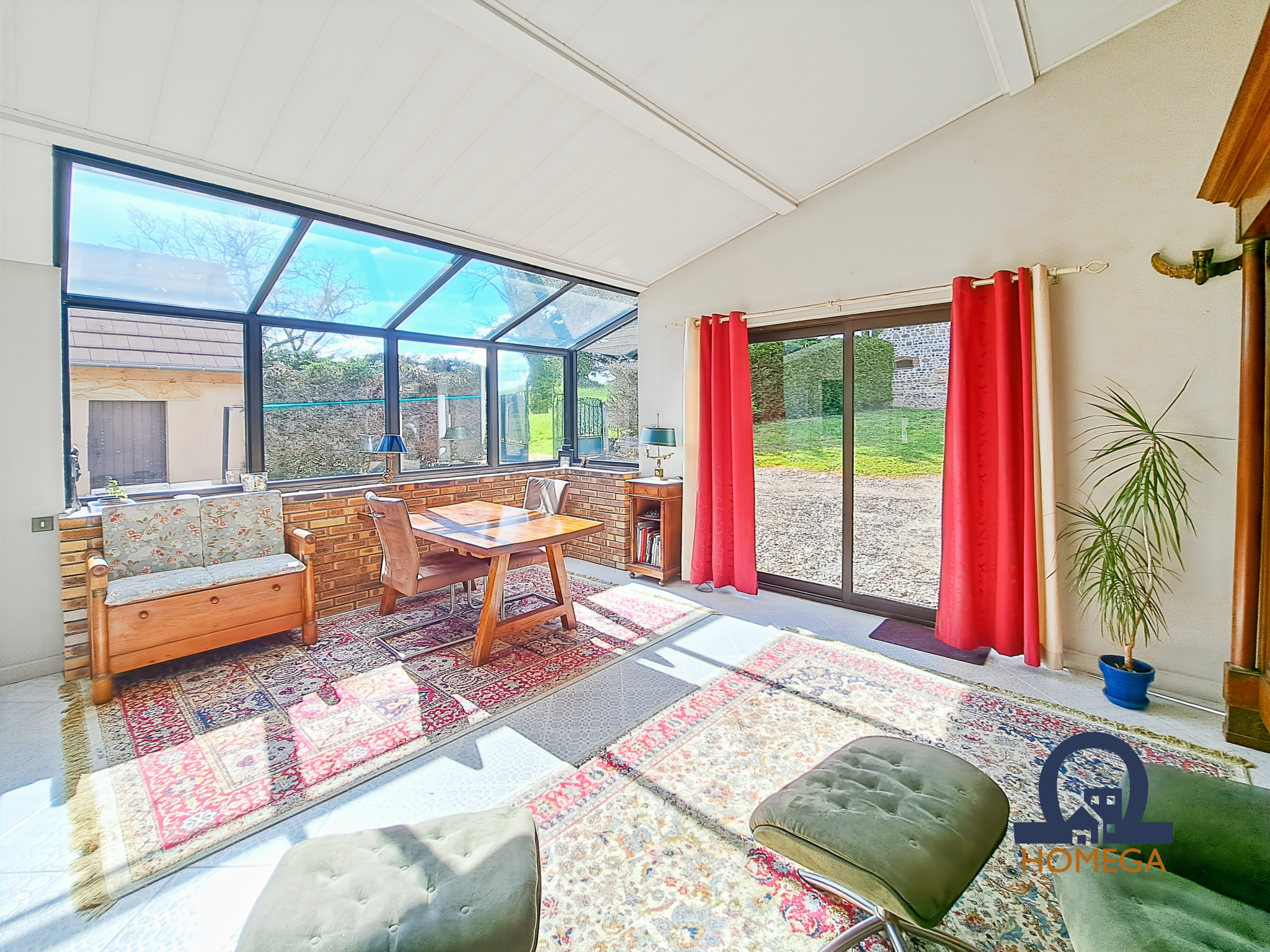 Une véranda lumineuse offrant une vue apaisante sur la nature environnante.