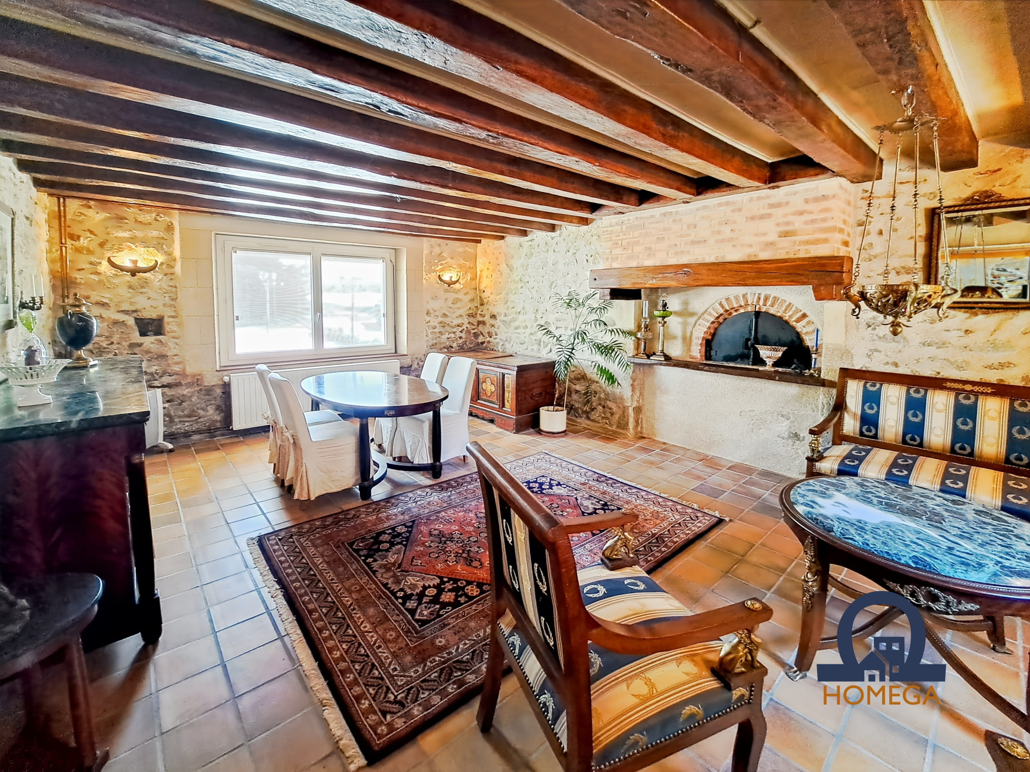 Un salon chaleureux et une salle à manger avec four à pain, parfaits pour cultiver l’esprit maison de campagne et recevoir en toute convivialité.