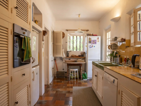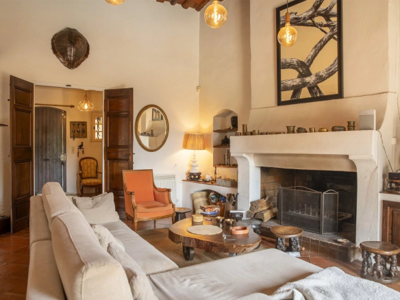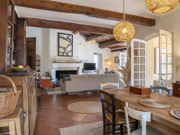 La maison principale d’environ 200 m² incarne le charme authentique de la Provence avec ses matériaux anciens – poutres en bois, sols en terre cuite – alliés à un confort contemporain. Le salon, baigné de lumière naturelle, s’ouvre largement sur les terrasses et le jardin, assurant une circulation fluide entre intérieur et extérieur.