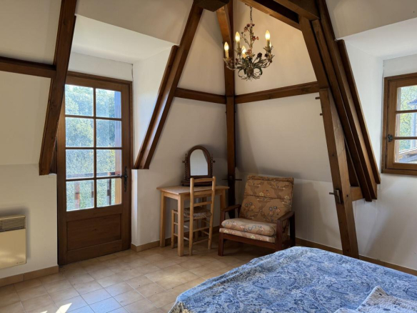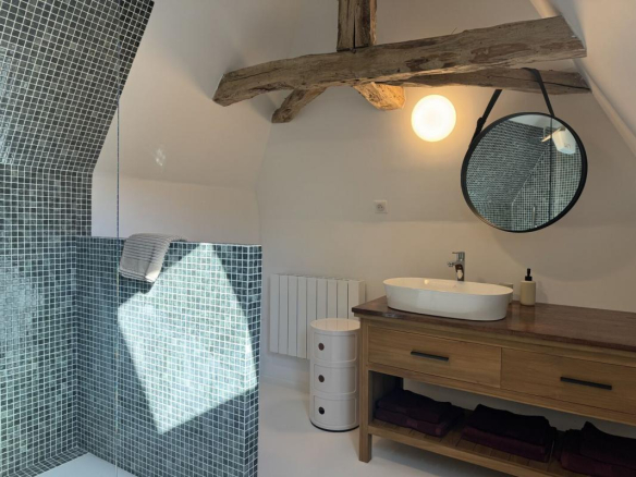 ?Grande chambre de 22 m² sous les poutres, avec salle de bains attenante, créant un espace cosy et spacieux.