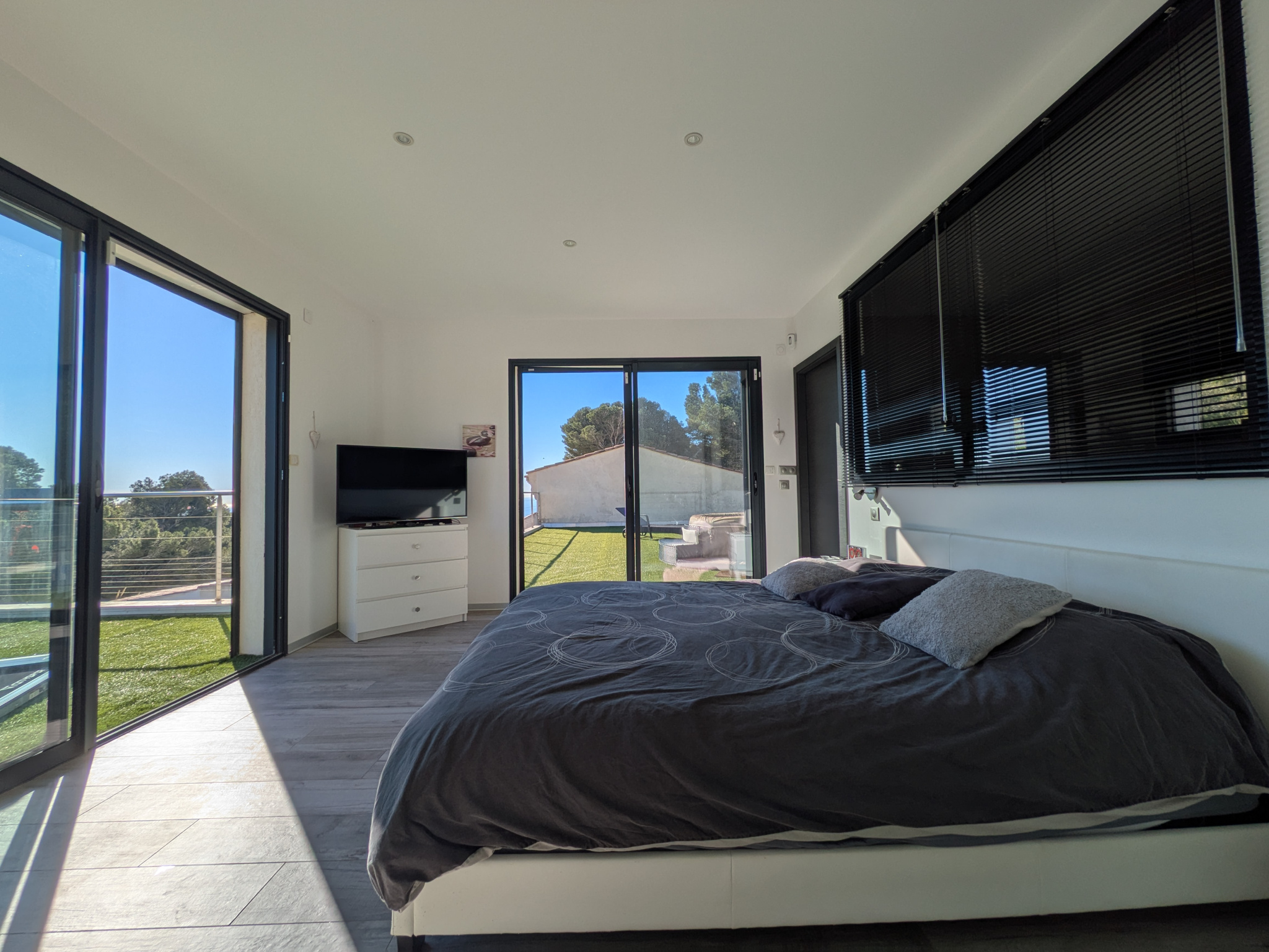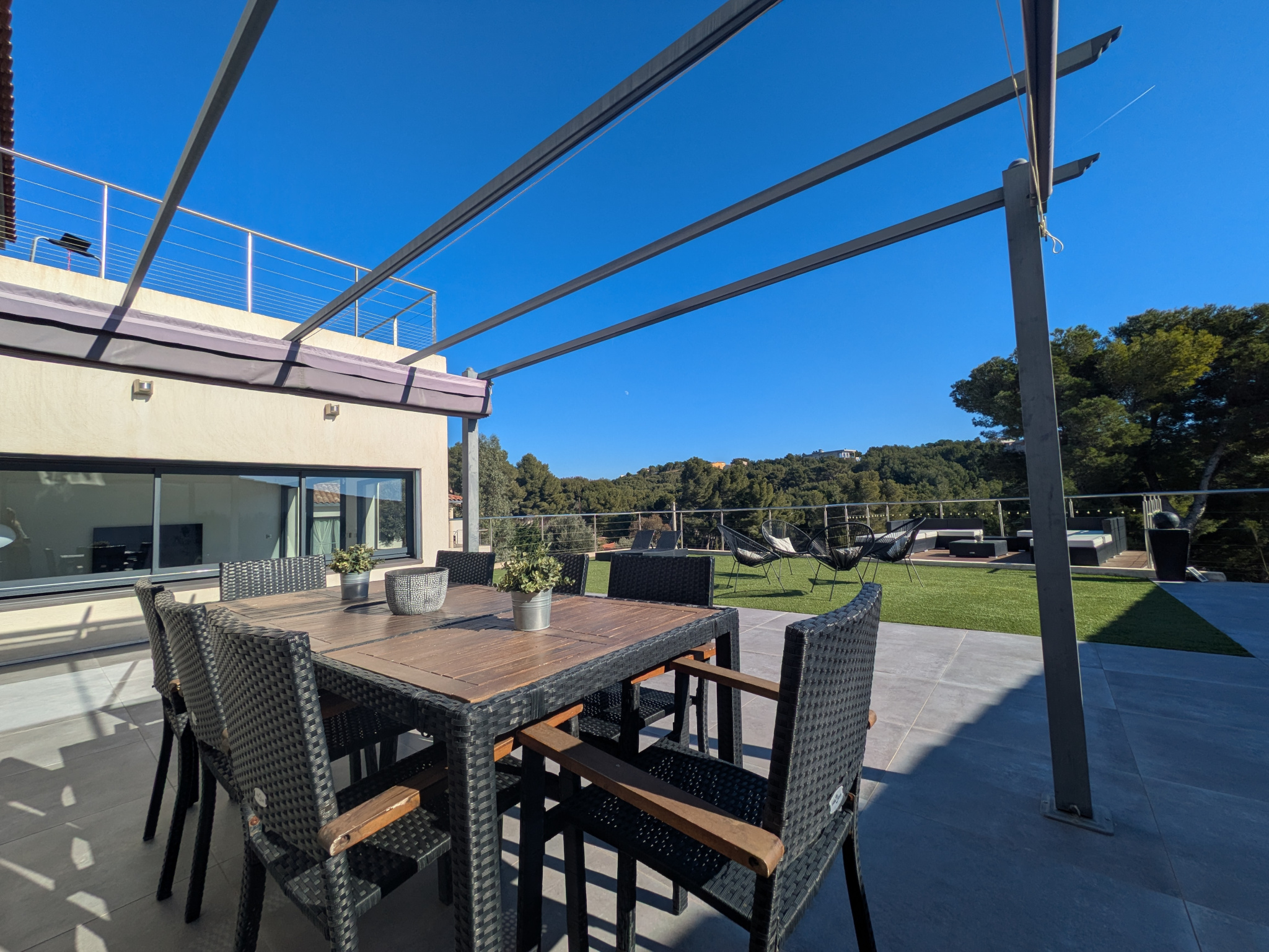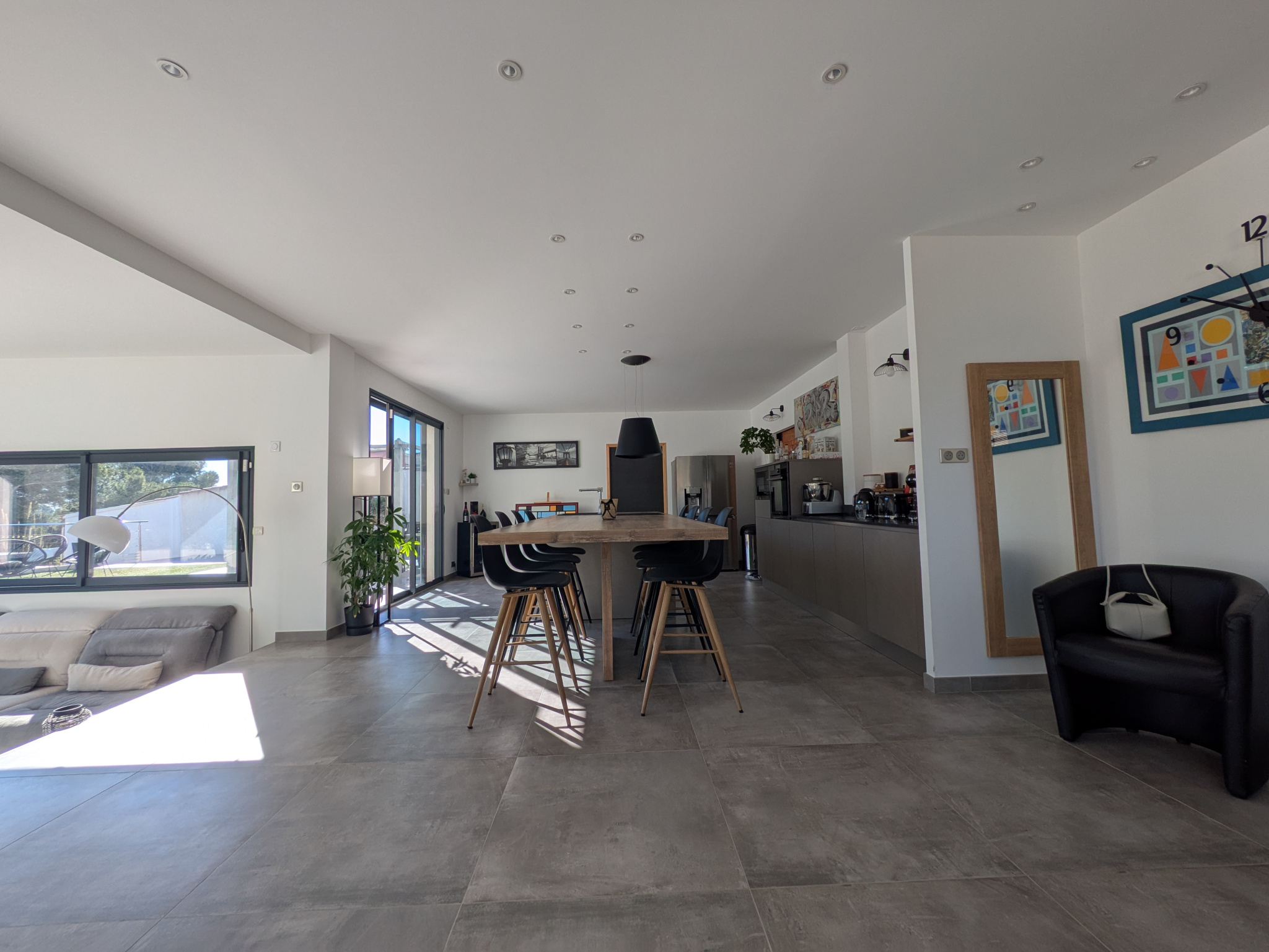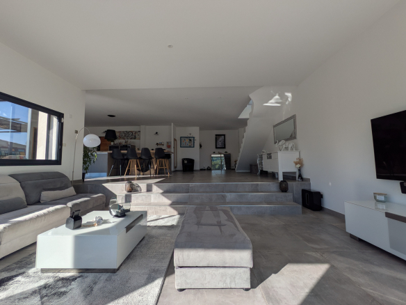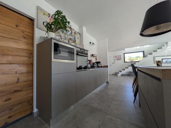 Dès l’entrée, les volumes séduisent. Environ 150 m2 d’espaces ouverts, une pièce de vie lumineuse prolongée par de grandes terrasses tournées vers l’horizon. La cuisine équipée se veut à la fois fonctionnelle et conviviale, complétée par une arrière-cuisine astucieuse et de nombreux rangements.