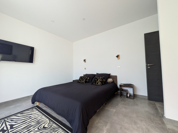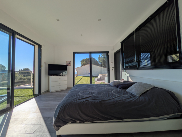 Côté nuit, trois chambres dont une suite parentale avec dressing, salle d’eau et terrasse face à la mer. Deux autres salles d’eau, deux WC, une buanderie et des espaces de rangement bien pensés facilitent le quotidien.