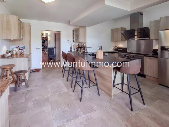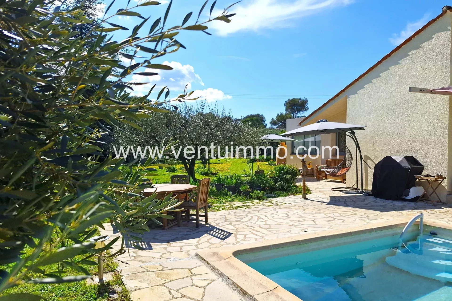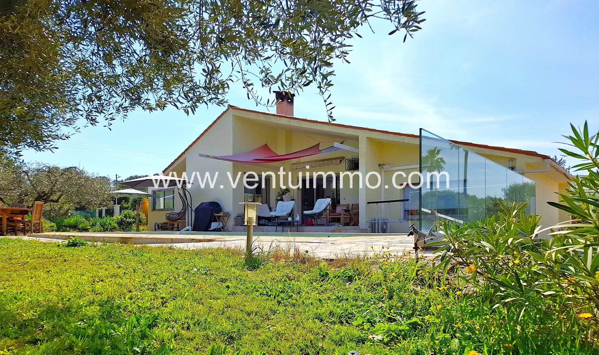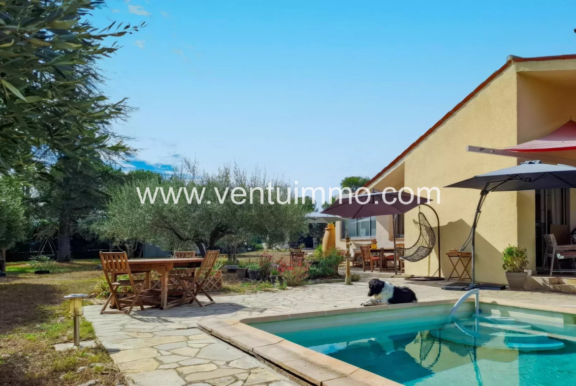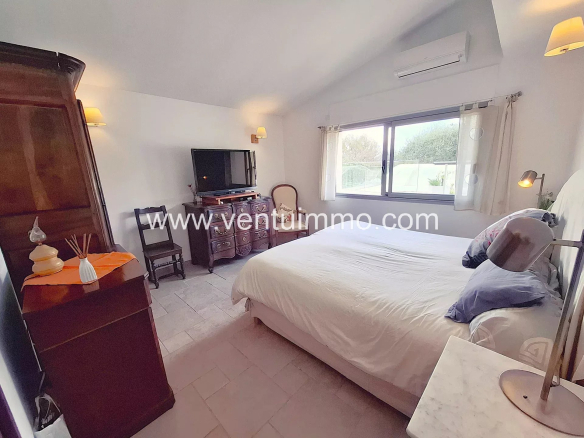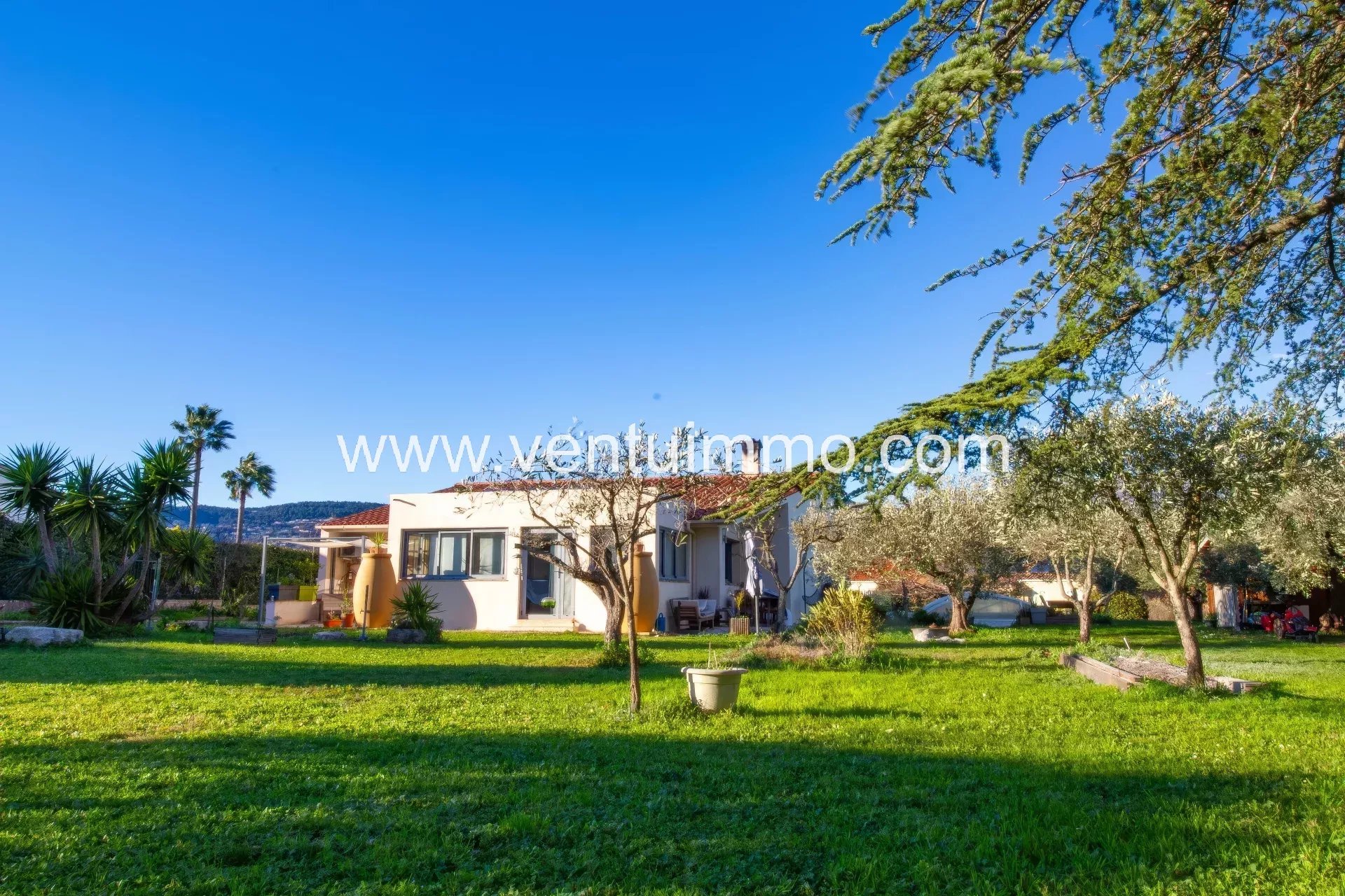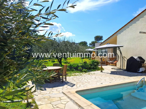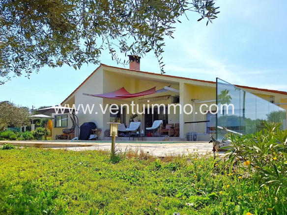 Implantée sur un parc paysager d’environ 2 800 m², planté d’essences méditerranéennes et d’oliviers, la propriété de plain-pied,, entièrement climatisée, offre 150 m² de beaux volumes lumineux.
