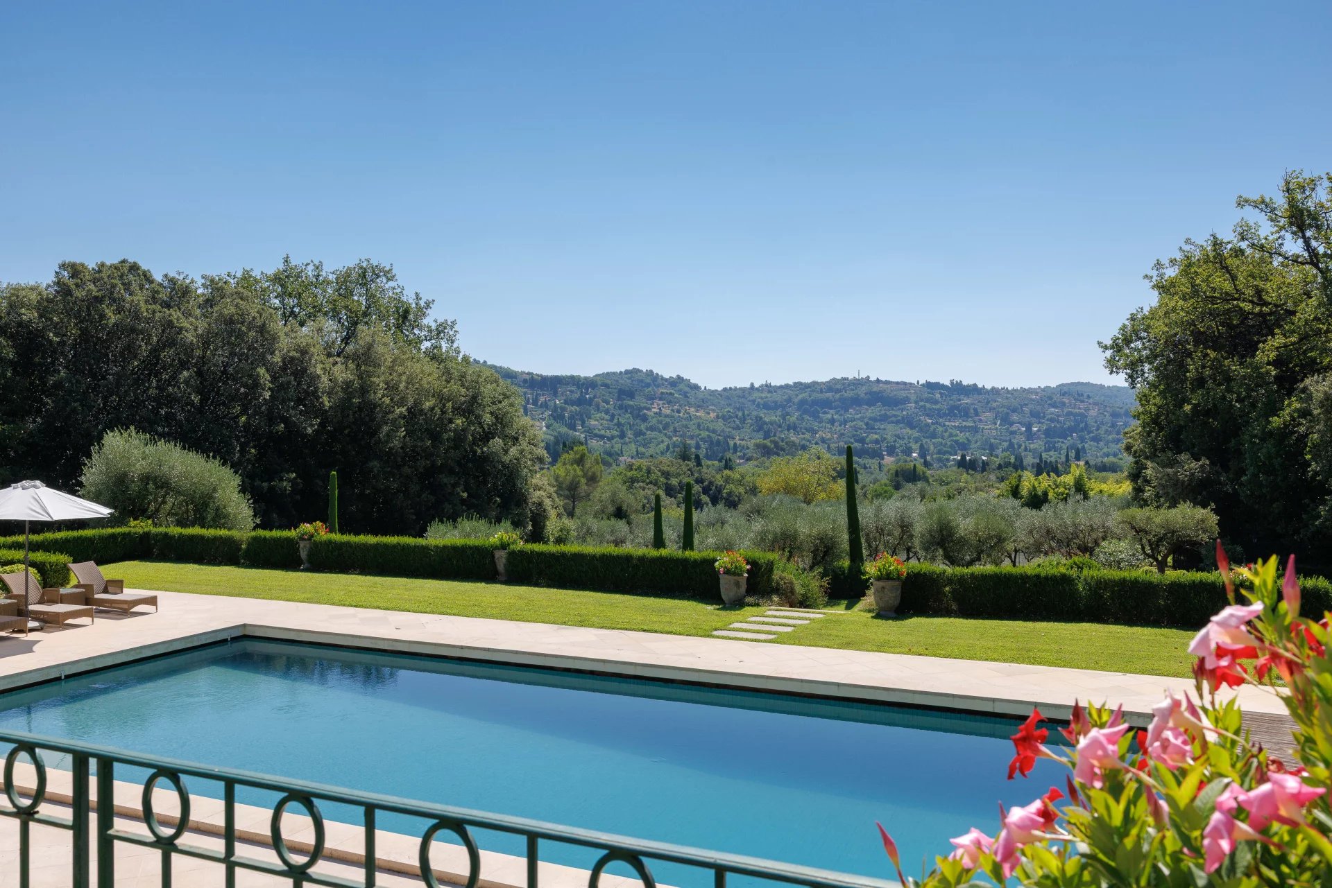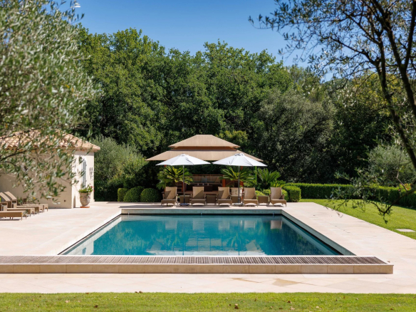 Exposée plein sud / sud-est, la bastide offre une vue dégagée sur le jardin, la grande piscine (15x7m) élégante avec son pool-house, et les collines verdoyantes des vallons environnants.
