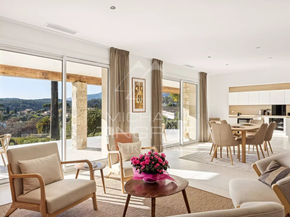 Découvrez cette magnifique propriété provençale de plain-pied, d’une superficie d’environ 288 m², entièrement rénovée avec soin. Nichée sur un terrain de 2200 m², cette villa située au calme, exposée à l’ouest, offre une vue dominante imprenable.