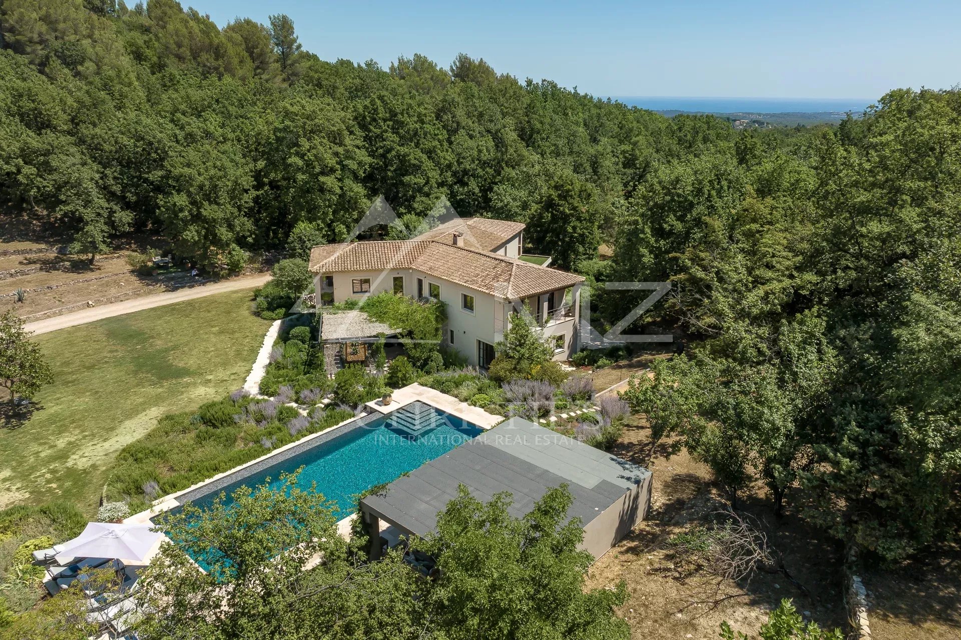 Son terrain de plus d’1,5 hectare dispose d’une incroyable piscine à débordement de 15 mètres, une grande terrasse lounge avec un bar et de magnifiques jardins paysagers.