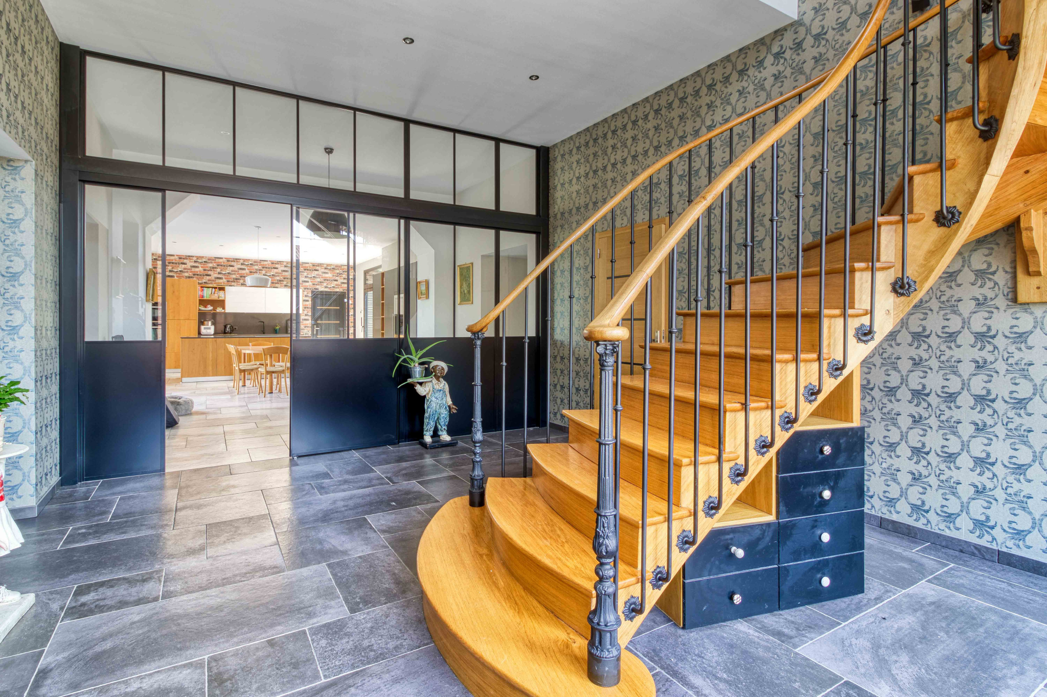 Aux étages la seconde suite parentale agrémentée de son dressing, sa salle de bains. Une chambre double, une deuxième salle de bains. Le bureau en open space et la salle de sport.