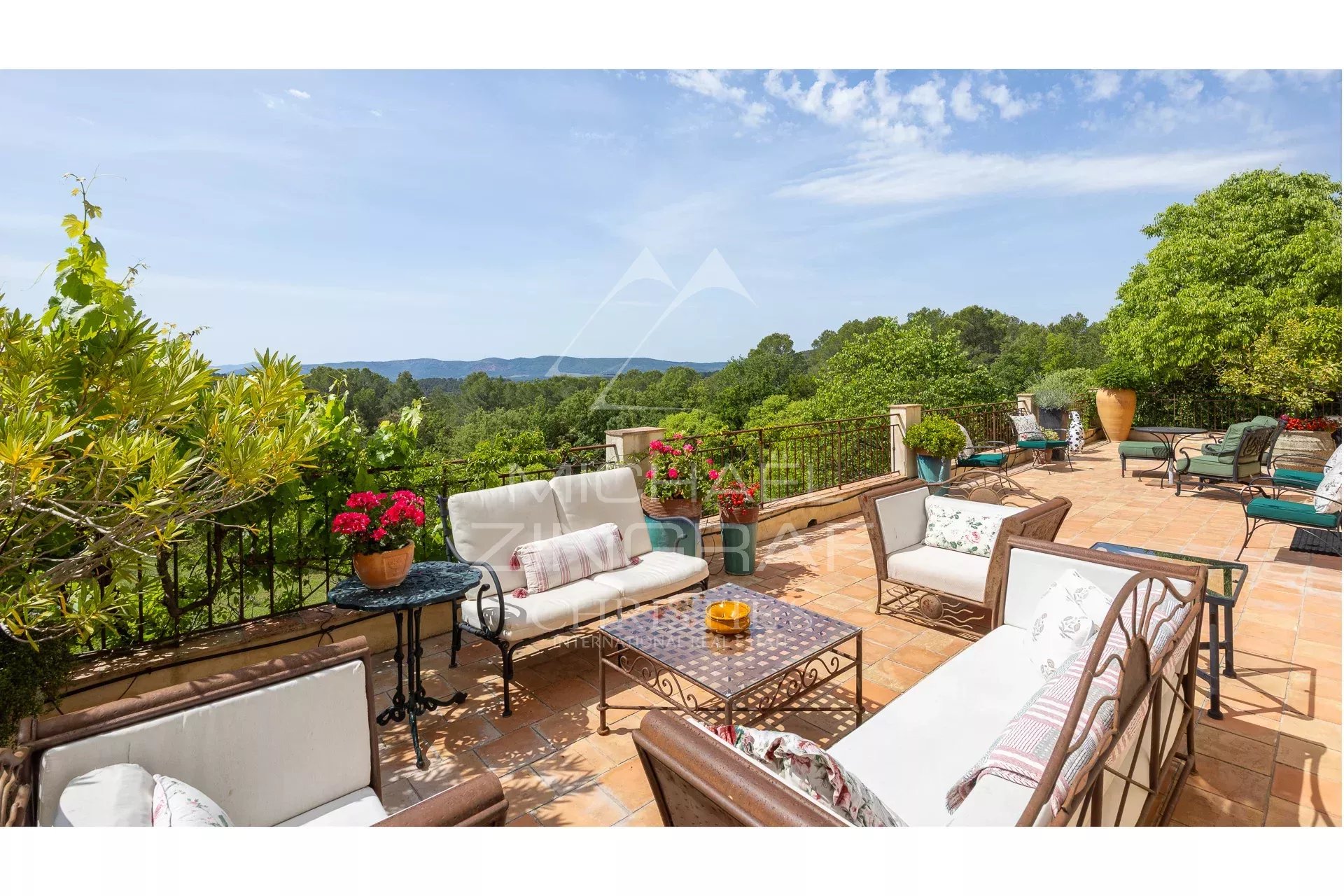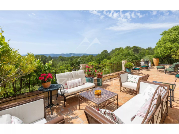 Depuis la maison, la vue embrasse les jardins paysagers, la piscine, la campagne environnante et les montagnes en toile de fond