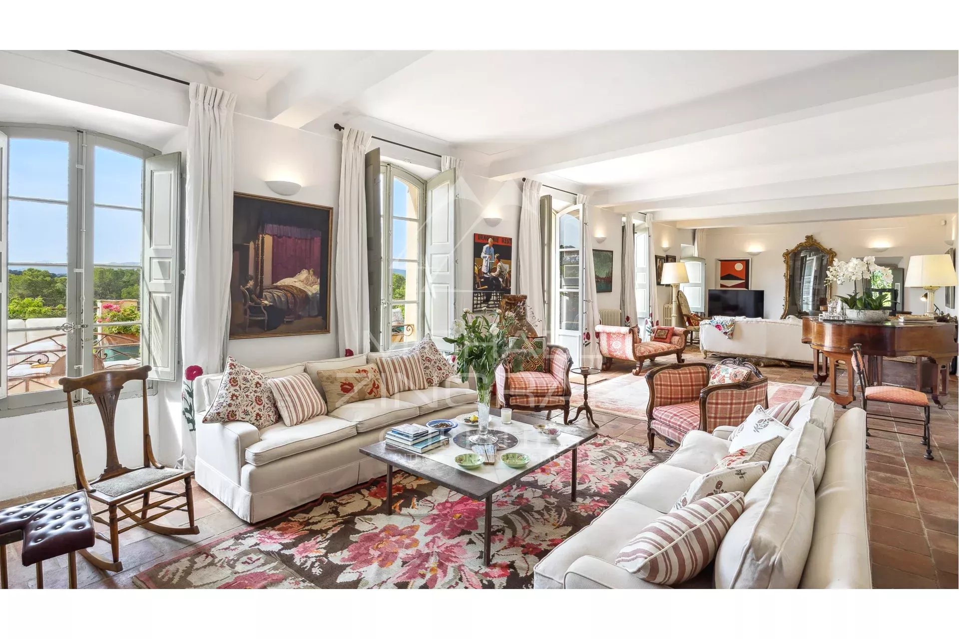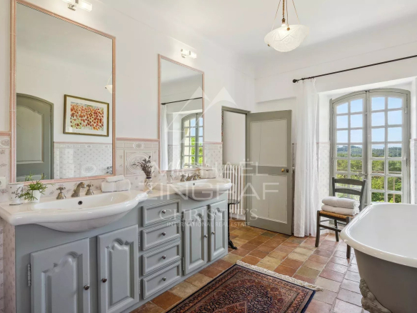 Rénovée avec élégance dans le respect de son histoire, la demeure principale offre de vastes volumes lumineux, dont un double séjour ouvrant sur une terrasse de 40 m², une cuisine-salle à manger contemporaine donnant également sur une grande terrasse, cinq chambres en suite, un bureau, une bibliothèque, une salle de jeux, deux WC invités, une cave à vin, ainsi que plusieurs dépendances.