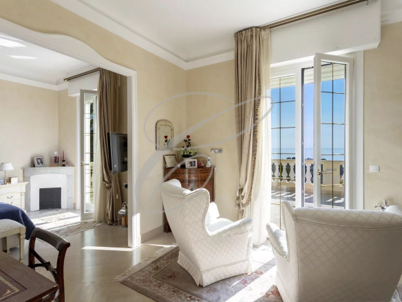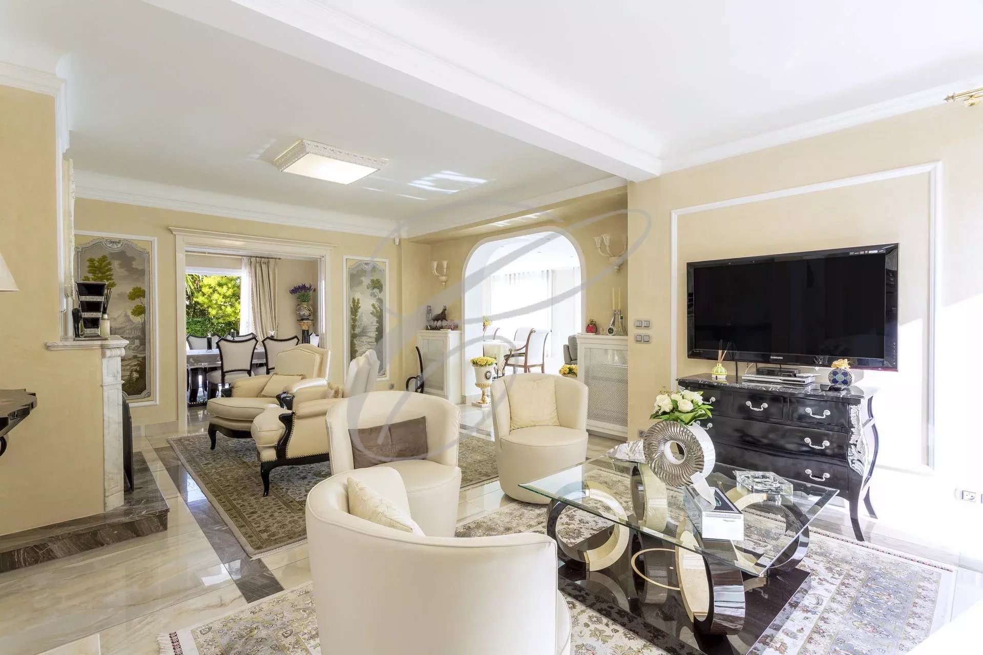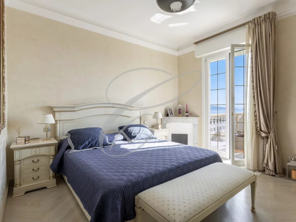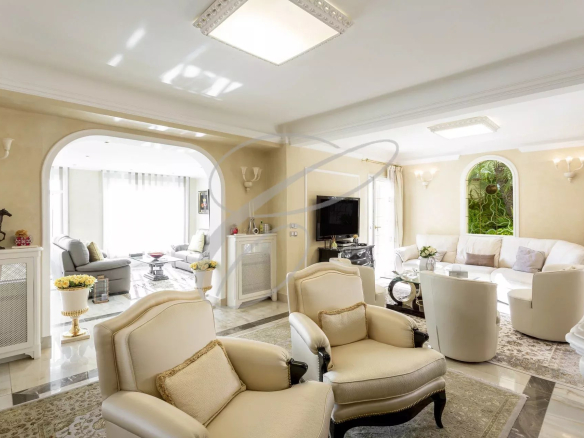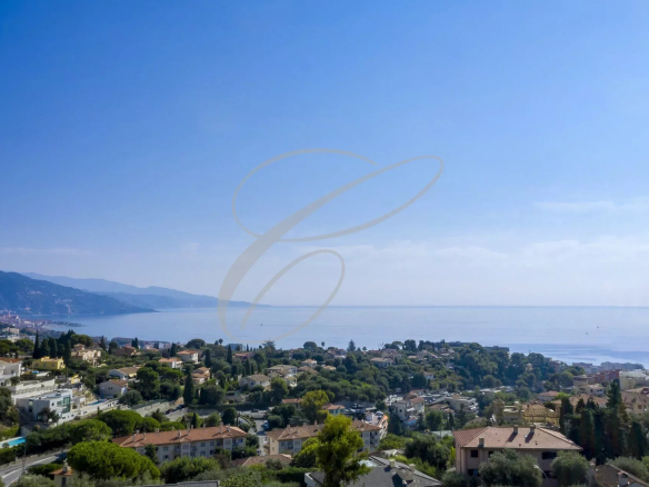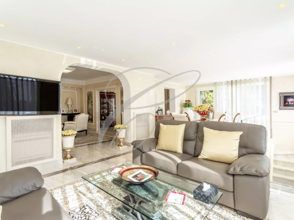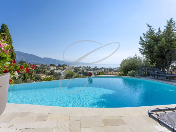 Secteur résidentiel du Hameau, magnifique villa luxueusement rénovée et décorée au cœur d’un jardin arboré avec piscine à débordement. Vue mer panoramique.