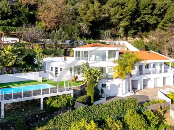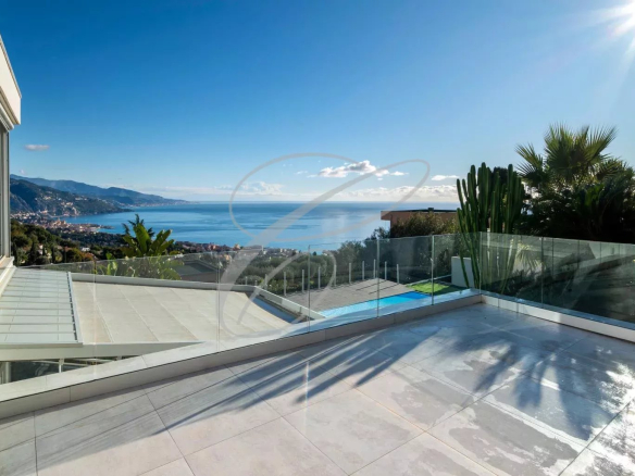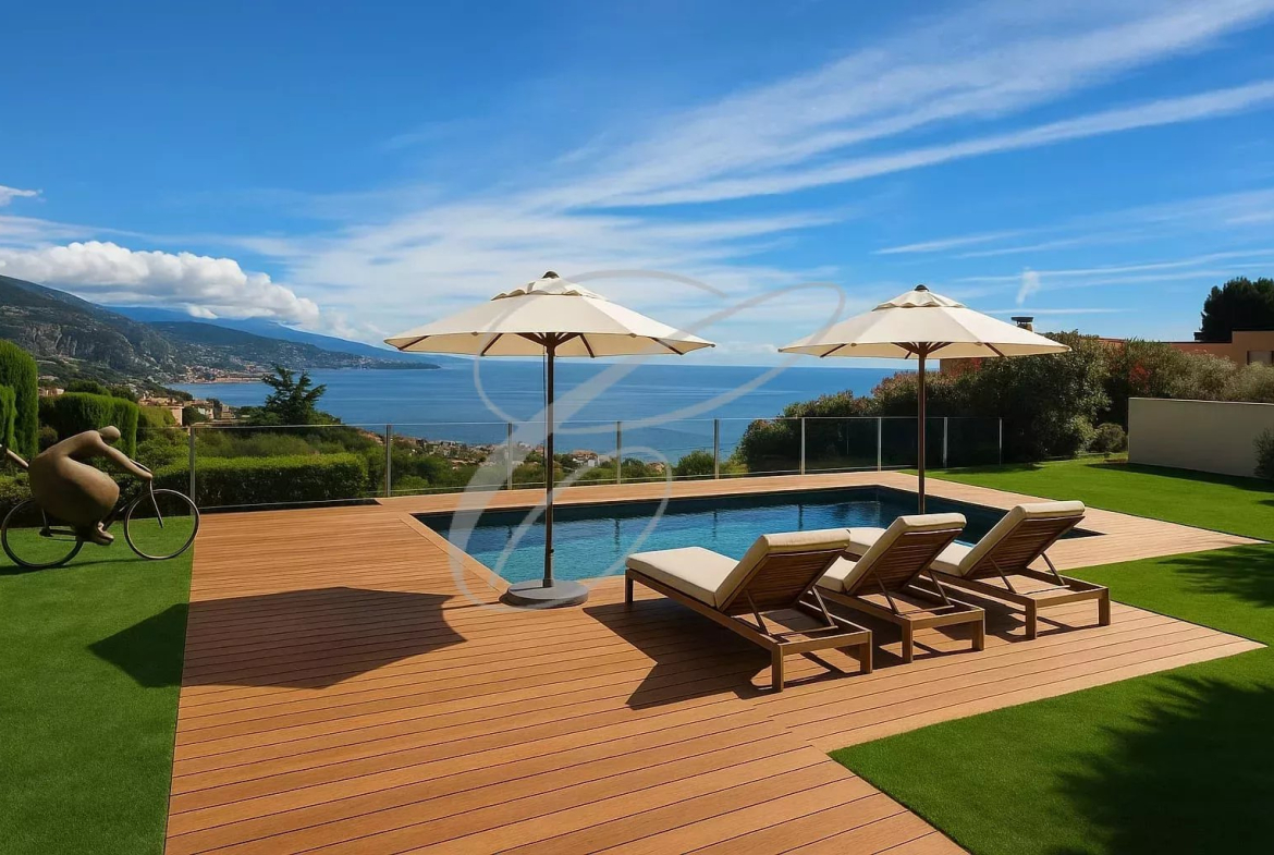 A quelques minutes de la Principauté de Monaco, luxueuse villa d’architecte d’environ 450 m² avec vue mer panoramique. Villa composée d’un spacieux séjour en mezzanine, cuisine équipée, 3 chambres en suite avec dressings. Un appartement de 2 pièces indépendant complète ce bien. Piscine, Solarium, pool-house, cuisine d’été. Deux garages, plusieurs stationnements extérieurs et un accès sécurisé par deux portails.