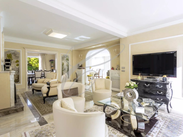 Secteur résidentiel du Hameau, magnifique villa luxueusement rénovée et décorée au cœur d’un jardin arboré avec piscine à débordement. Vue mer panoramique.