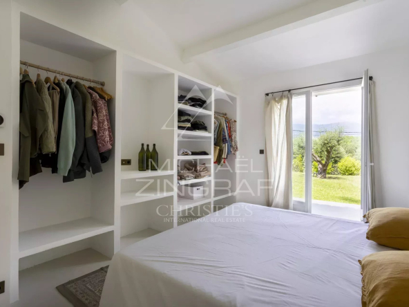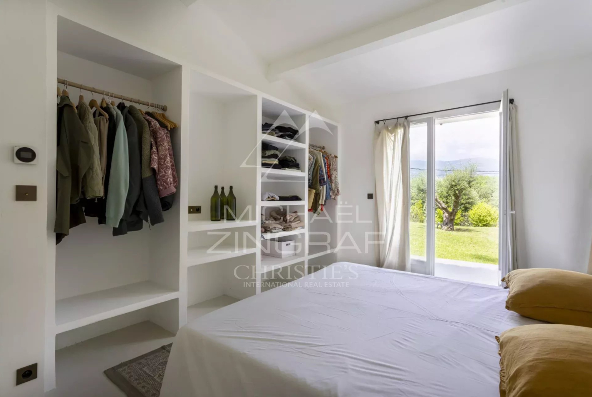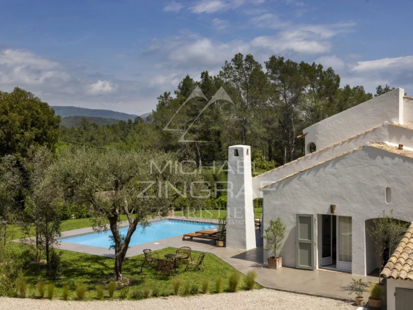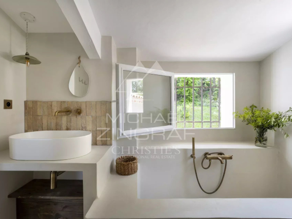 À l’extérieur, un superbe jardin paysager d’environ 3 000 m², planté d’oliviers centenaires et d’essences méditerranéennes, s’organise autour d’une agréable piscine, invitant à la détente.