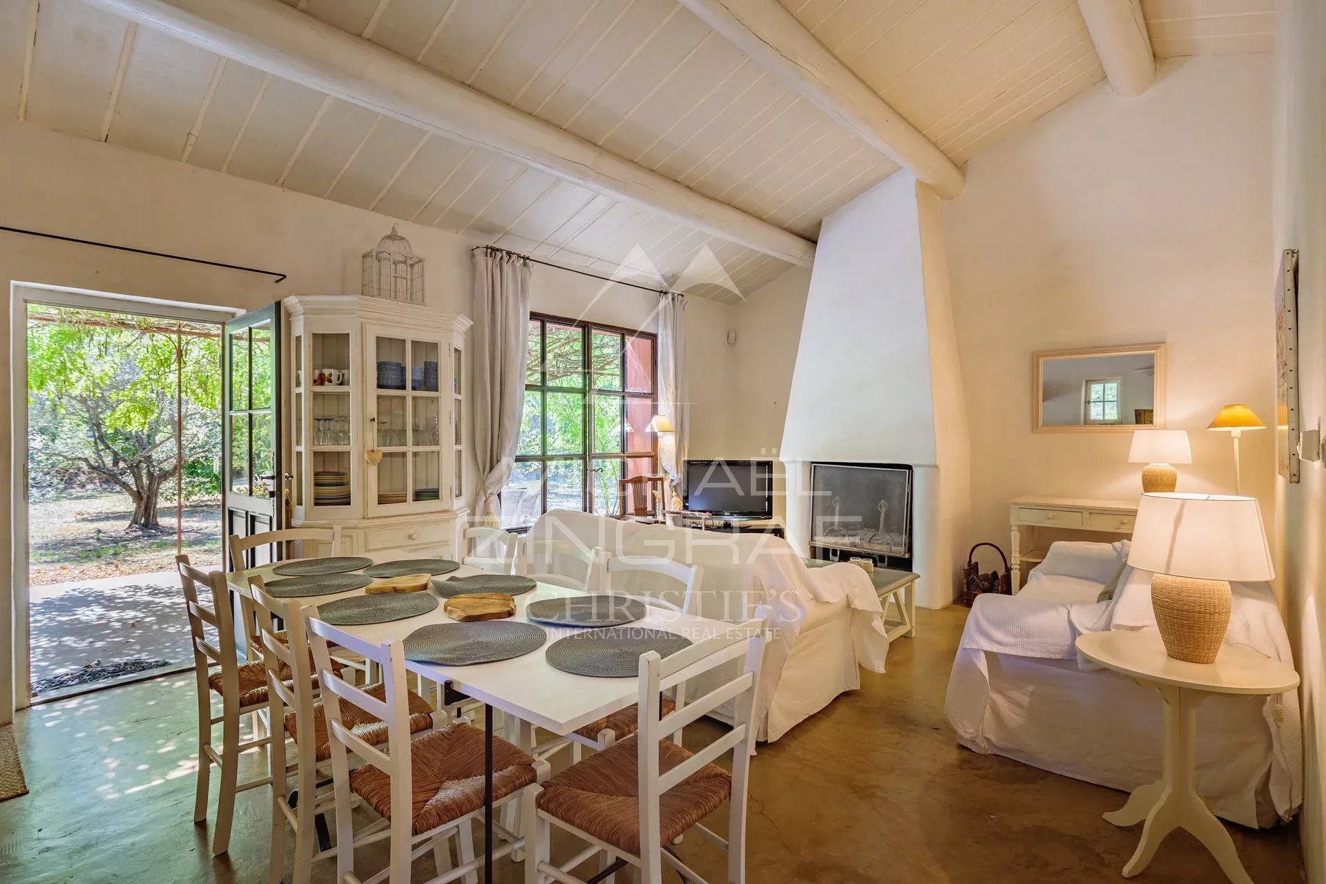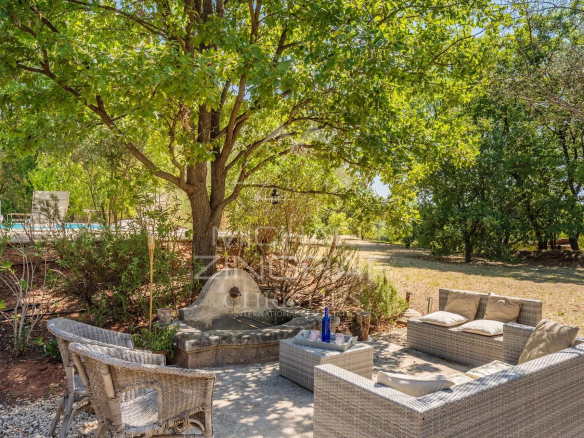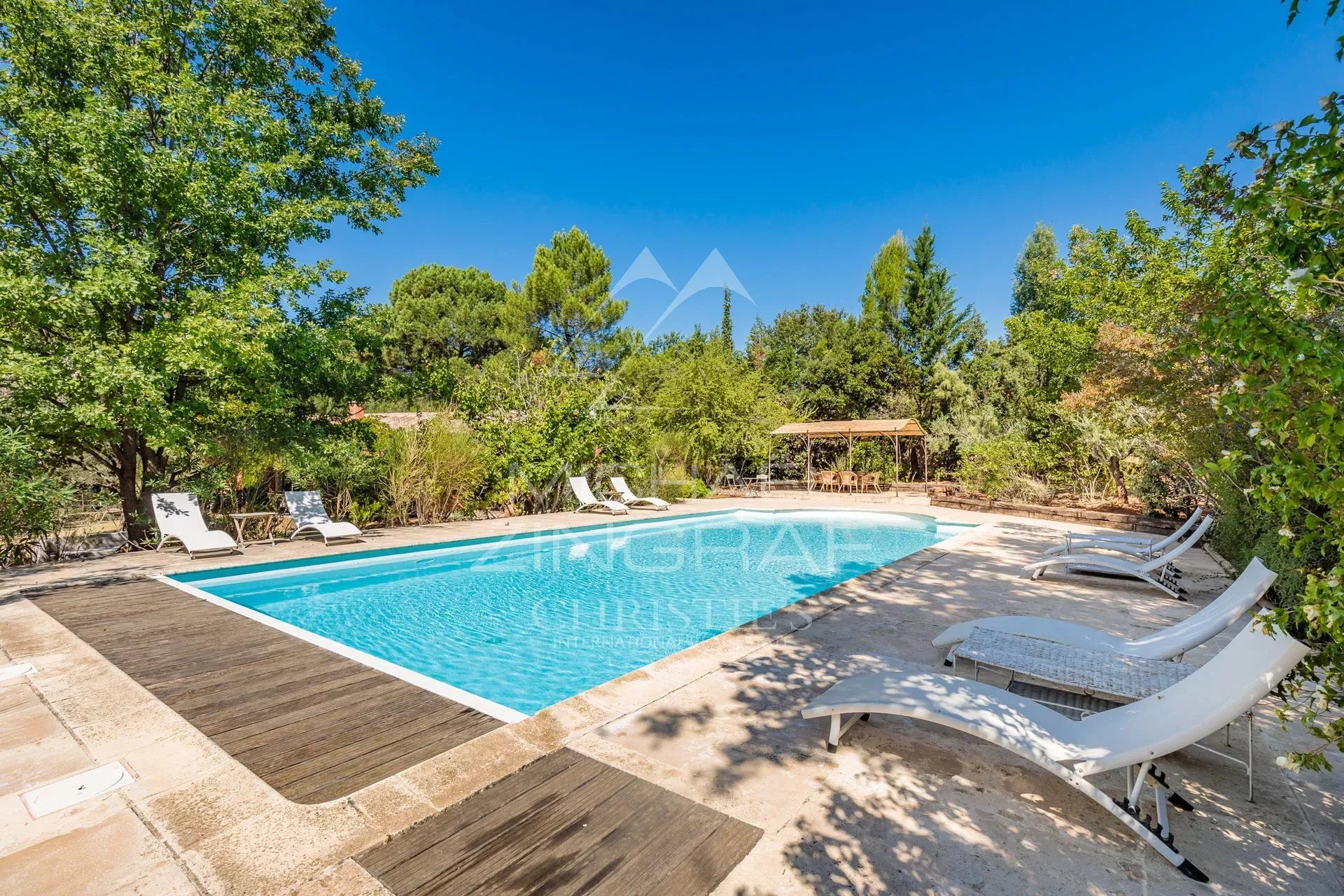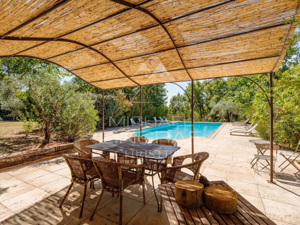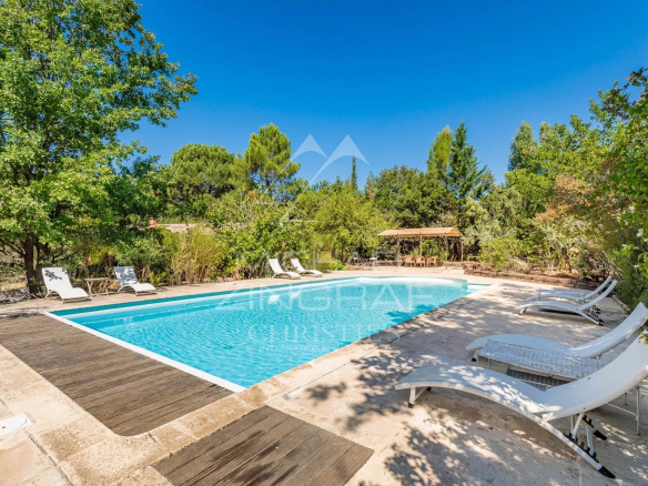 A l’extérieur, un beau terrain arboré d’environ 5 450m² bénéficiant d’un arrosage automatique alimenté avec l’eau du canal de Provence, accueille un bel espace de détente autour d’une grande piscine de 12x6m chauffée avec volet roulant intégré.