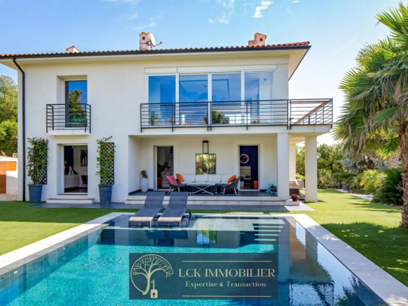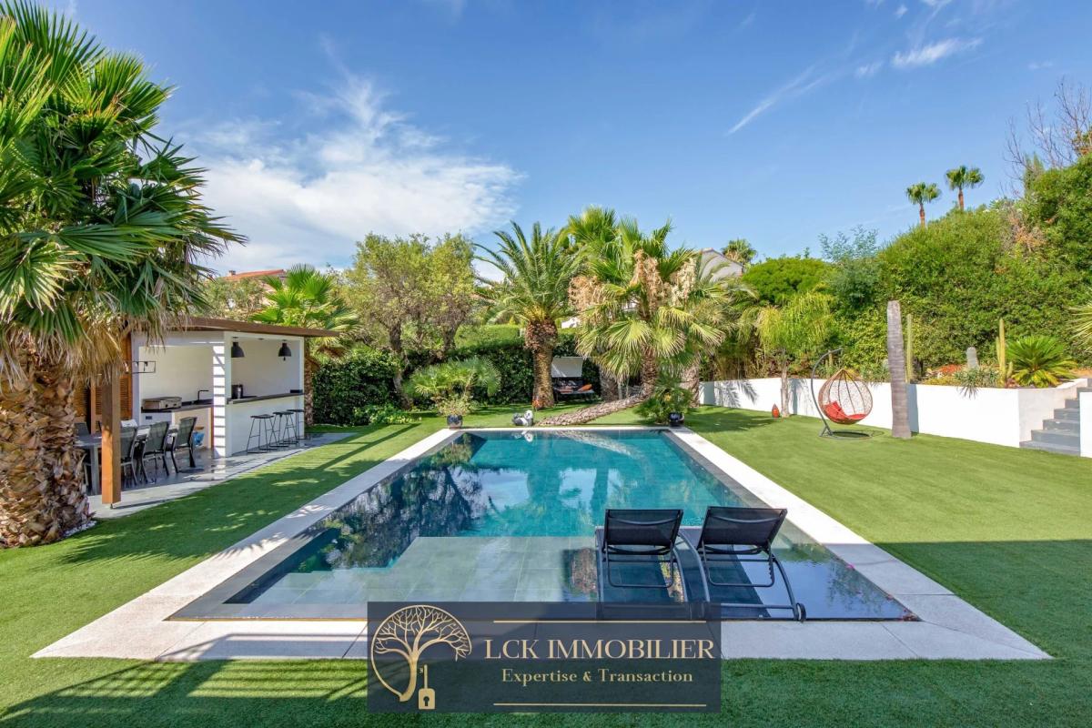 A l’extérieur : Piscine miroir, cuisine d’été équipée, terrain clos et paysagé.