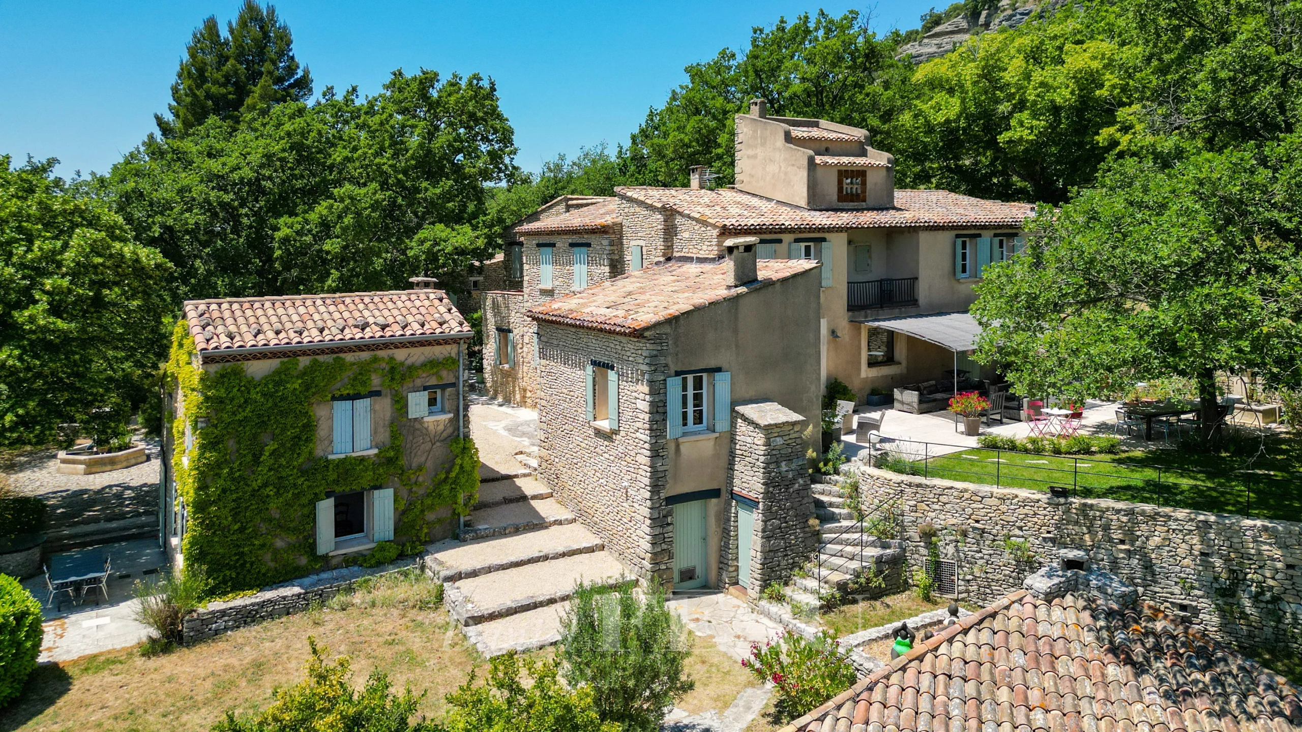 L’ensemble constitue un hameau et développe plus de 400 m2 répartis sur six bâtis en pierre, organisés autour d’une élégante cour pavée agrémentée d’une fontaine centrale.