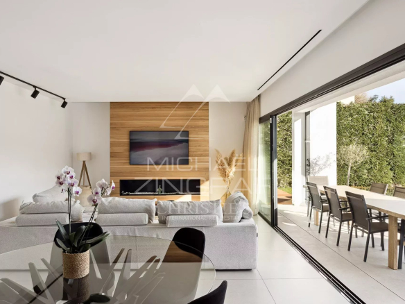 Son design moderne offre de larges baies vitrées ouvrant sur le jardin plat exposé sud-ouest, avec une superbe piscine au sel de 10m sur 5m, baignée de soleil et chauffée pour étendre son utilisation en fin de saison.