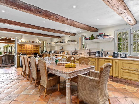 La propriété comprend une maison principale aux volumes majestueux (5 chambres, bureau, cuisines intérieure et extérieure), une maison d’amis au charme intemporel avec 3 chambres, et un appartement de gardien indépendant, pour un total d’environ 730m2.