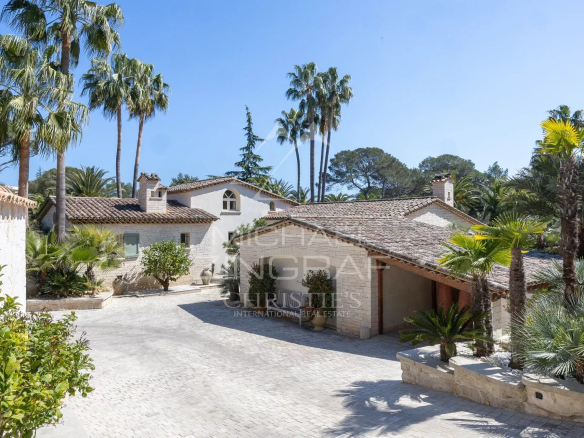 Dans un domaine fermé, sécurisé et préservé des regards, cette propriété rare vous invite à un art de vivre unique. Idéalement exposée plein sud, elle se dresse sur un terrain plat de 2 810 m² magnifiquement paysagé, planté de près de 100 palmiers, avec une grande piscine chauffée.