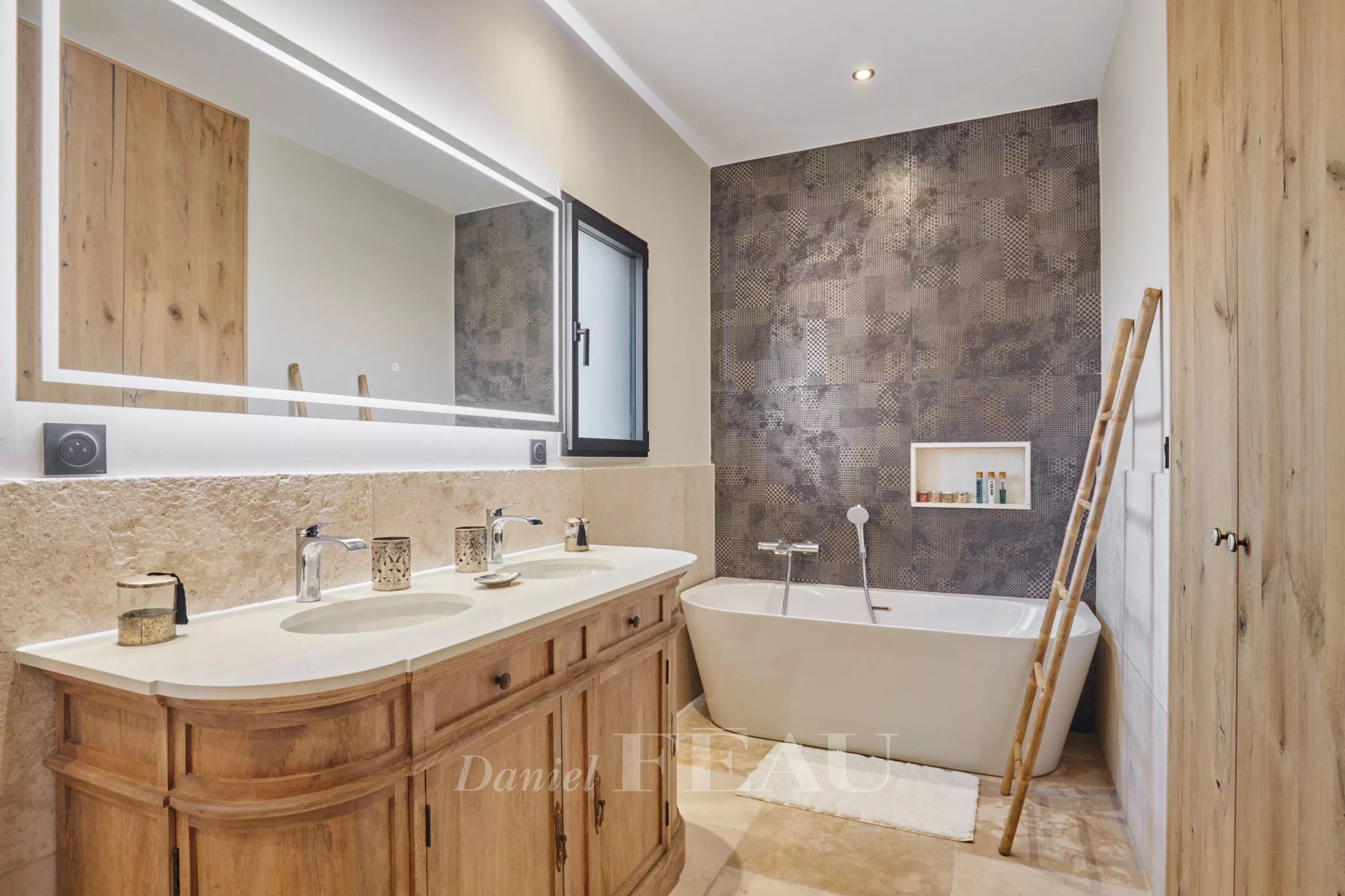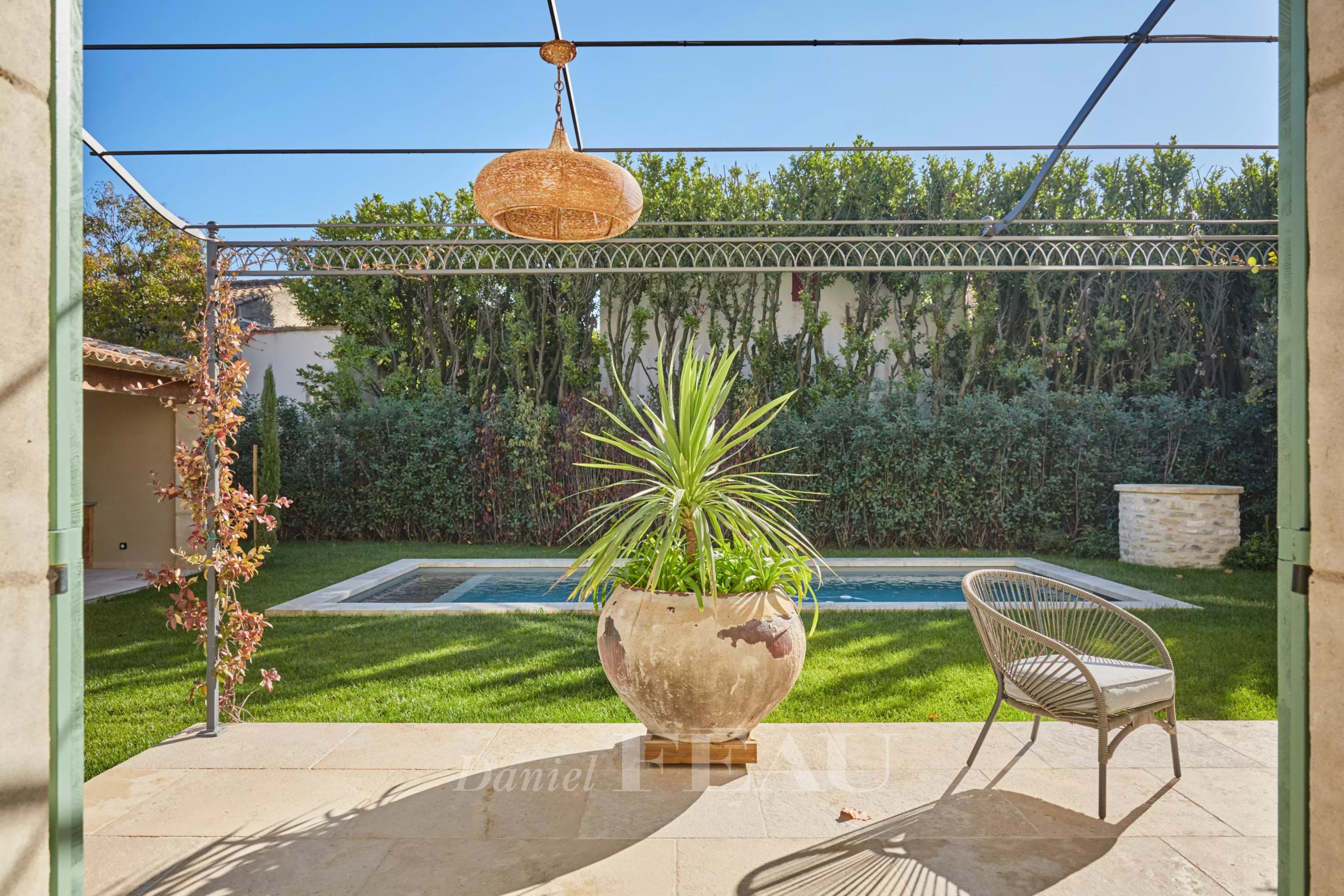 Le jardin clos de 847 m² accueille une piscine chauffée, un pool house et des aménagements modulables, au gré des envies et des saisons.