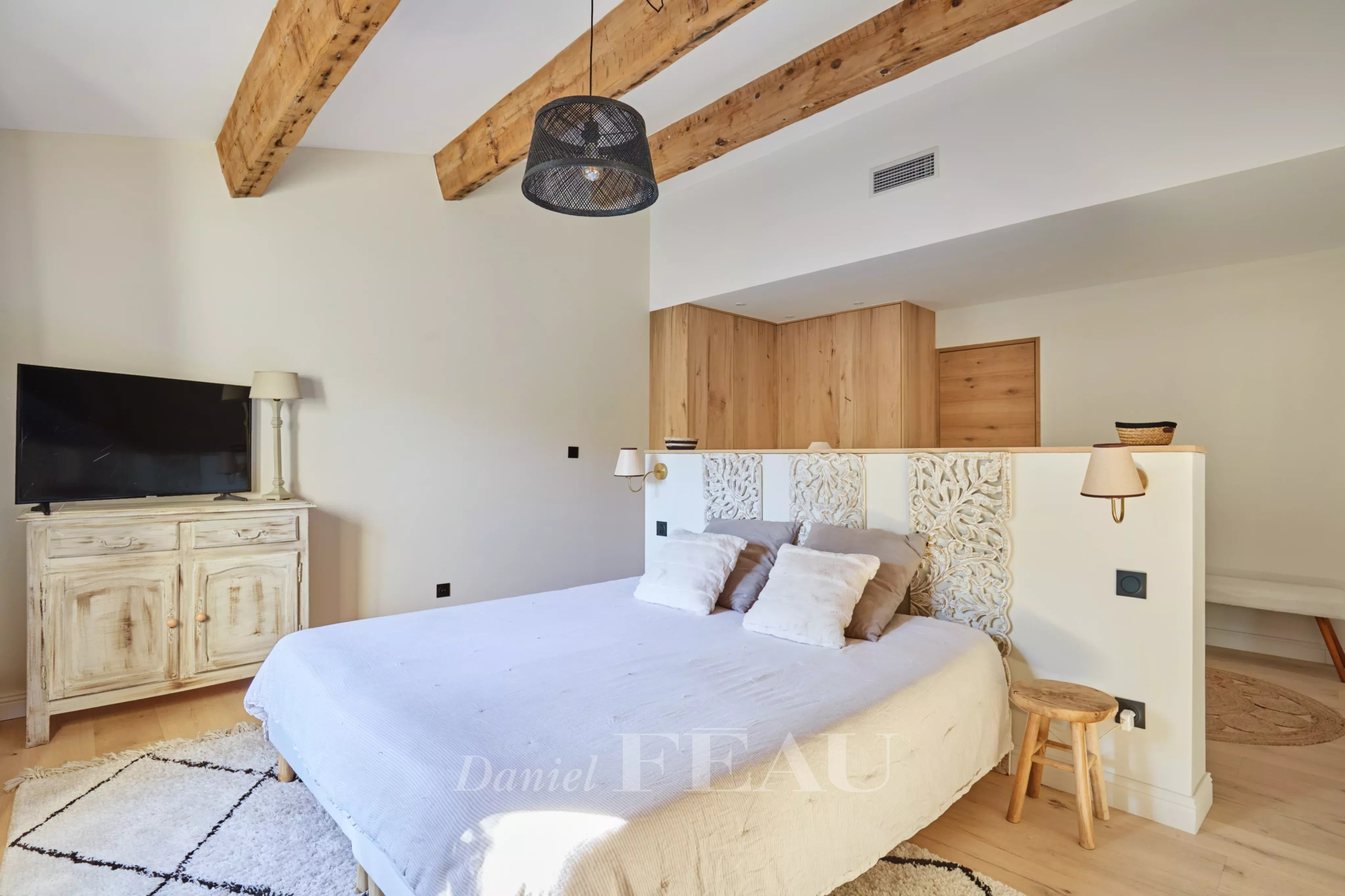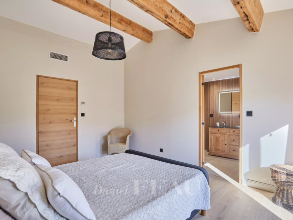 Dès le rez-de-chaussée, la lumière inonde la vaste pièce de vie, révélant les poutres apparentes et de larges baies ouvertes sur le jardin. Une suite parentale avec dressing et salle de bains complète ce niveau, proposant un espace fonctionnel et confortable.