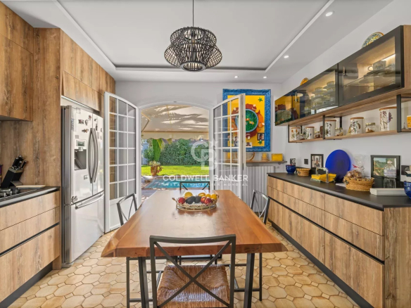 Implantée sur un jardin paysager de 1 000 m², soigneusement entretenu et planté d’essences méditerranéennes et d’arbres fruitiers, la propriété offre un cadre de vie rare, agrémenté d’une piscine en mosaïque, d’une vaste terrasse ensoleillée et d’une élégante palmeraie, à l’abri des regards.