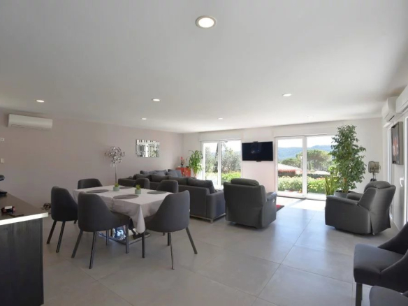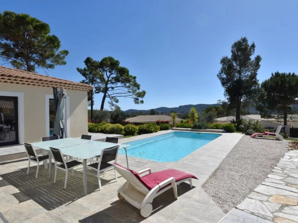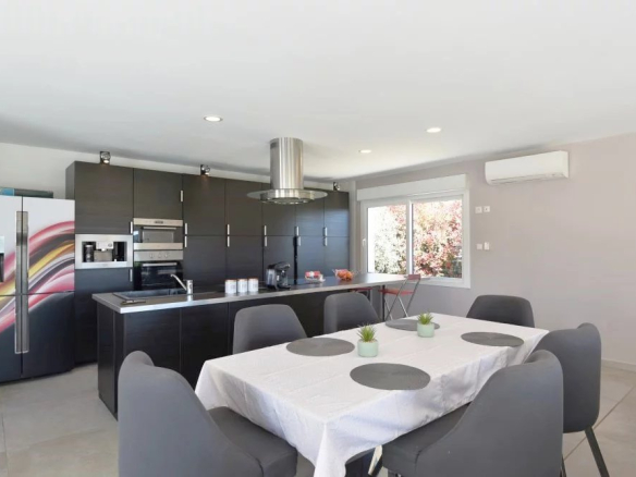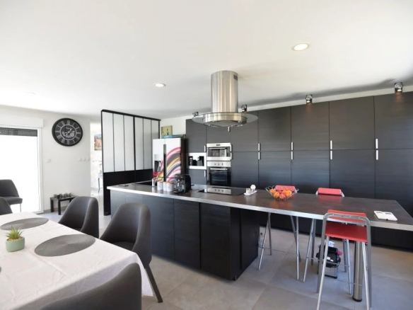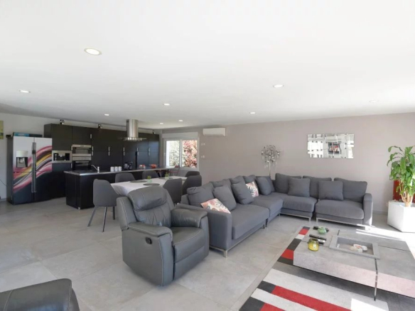 Dans un secteur résidentiel en situation dominante, belle villa contemporaine de plain-pied de 180 m² environ comprenant: entrée, un séjour spacieux et lumineux avec cuisine ouverte équipée, une chambre maitre avec dressing et salle de bains, deux autres chambres et une salle d’eau. Garage. Piscine. Terrain de 1676 m².